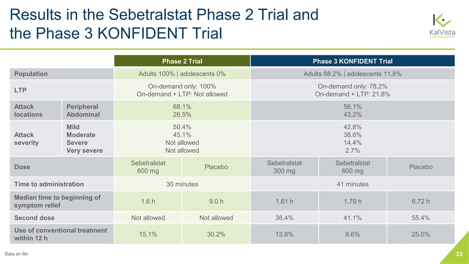 Results in the Sebetralstat Phase 2 Trial and the Phase 3 KONFIDENT Trial Phase 2 Trial Phase 3 KONFIDENT Trial Population Adults 100% | adolescents 0% Adults 88.2% | adolescents 11.8% On-demand only: 100% On-demand only: 78.2% LTP On-demand + LTP: Not allowed On-demand + LTP: 21.8% Attack Peripheral 68.1% 56.1% locations Abdominal 26.5% 43.2% Mild 50.4% 42.8% Attack Moderate 45.1% 38.6% severity Severe Not allowed 14.4% Very severe Not allowed 2.7% Sebetralstat Sebetralstat Sebetralstat Dose Placebo Placebo 600 mg 300 mg 600 mg Time to administration 30 minutes 41 minutes Median time to beginning of 1.6 h 9.0 h 1.61 h 1.79 h 6.72 h symptom relief Second dose Not allowed Not allowed 38.4% 41.1% 55.4% Use of conventional treatment 15.1% 30.2% 13.8% 8.6% 25.0% within 12 h Data on file 23
