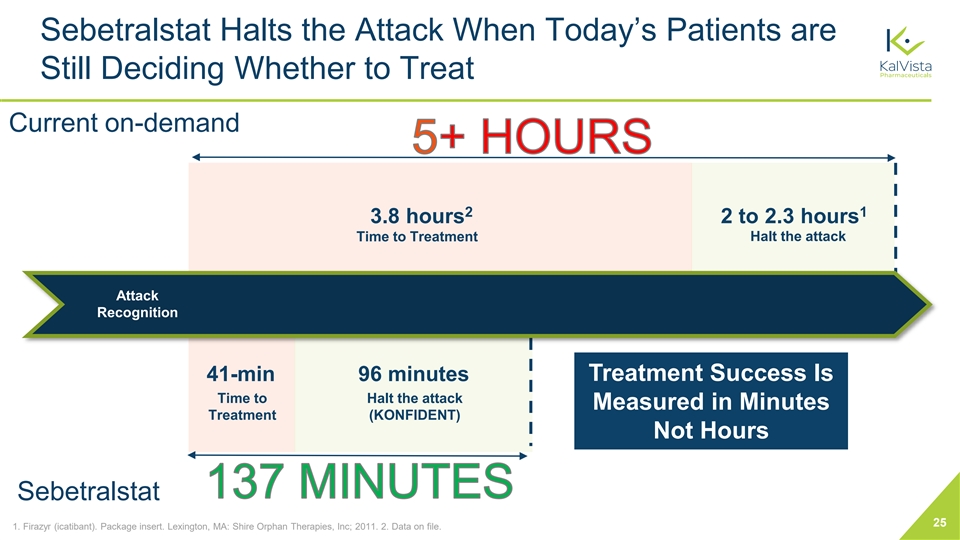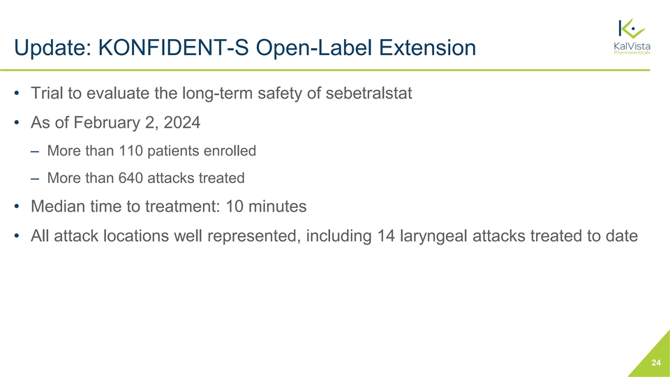 Update: KONFIDENT-S Open-Label Extension • Trial to evaluate the long-term safety of sebetralstat • As of February 2, 2024 ‒ More than 110 patients enrolled ‒ More than 640 attacks treated • Median time to treatment: 10 minutes • All attack locations well represented, including 14 laryngeal attacks treated to date 24
