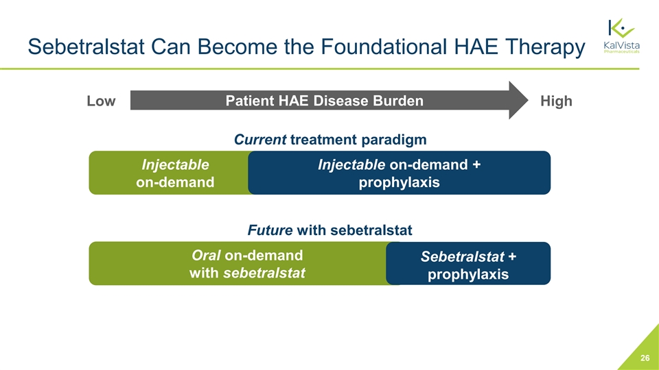 Sebetralstat Halts the Attack When Today’s Patients are Still Deciding Whether to Treat Current on-demand 5+ HOURS 2 1 3.8 hours 2 to 2.3 hours Time to Treatment Halt the attack Attack Recognition 41-min 96 minutes Treatment Success Is Time to Halt the attack Measured in Minutes Treatment (KONFIDENT) Not Hours 137 MINUTES Sebetralstat 25 1. Firazyr (icatibant). Package insert. Lexington, MA: Shire Orphan Therapies, Inc; 2011. 2. Data on file.