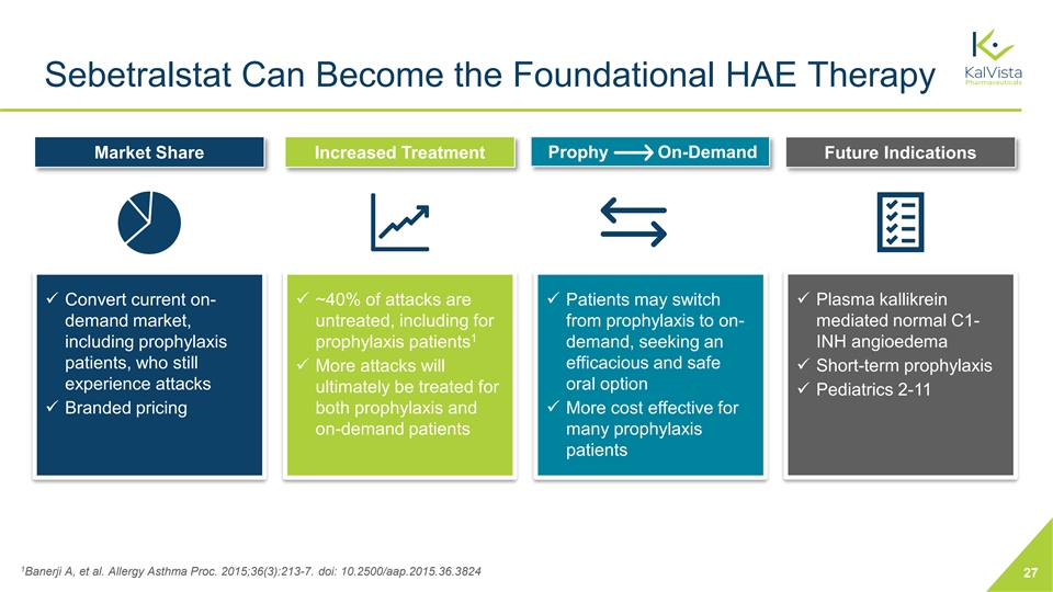 Sebetralstat Can Become the Foundational HAE Therapy Low Patient HAE Disease Burden High Current treatment paradigm Injectable Injectable on-demand + on-demand prophylaxis Future with sebetralstat Oral on-demand Sebetralstat + with sebetralstat prophylaxis 26