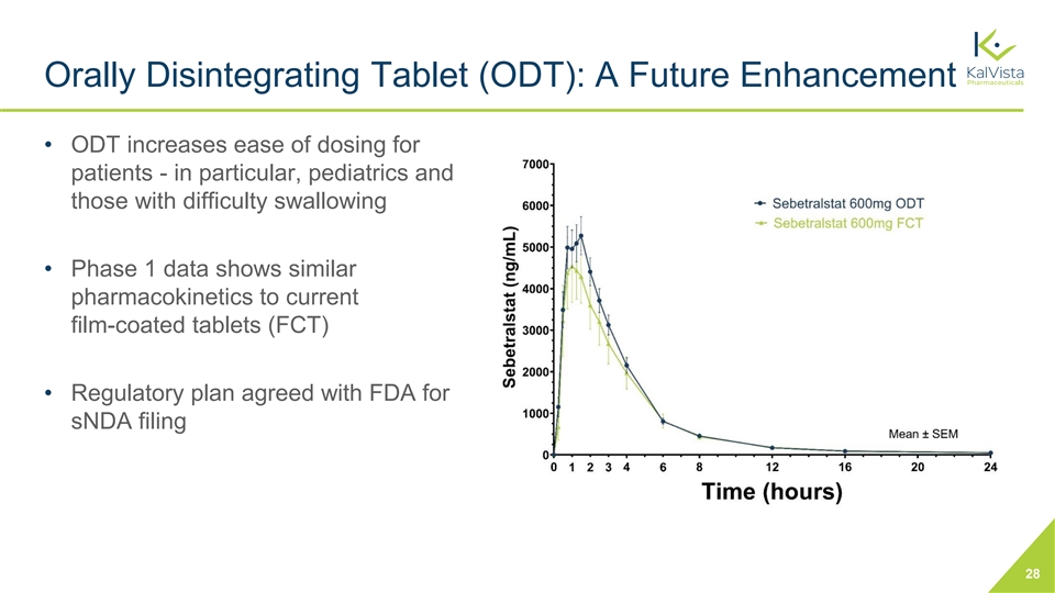 Sebetralstat Can Become the Foundational HAE Therapy Prophy On-Demand Market Share Increased Treatment Future Indications ✓ Convert current on-✓ ~40% of attacks are ✓ Patients may switch ✓ Plasma kallikrein mediated normal C1- demand market, untreated, including for from prophylaxis to on- 1 including prophylaxis prophylaxis patients demand, seeking an INH angioedema patients, who still efficacious and safe ✓ More attacks will ✓ Short-term prophylaxis experience attacks oral option ultimately be treated for ✓ Pediatrics 2-11 ✓ Branded pricing both prophylaxis and ✓ More cost effective for on-demand patients many prophylaxis patients 1 Banerji A, et al. Allergy Asthma Proc. 2015;36(3):213-7. doi: 10.2500/aap.2015.36.3824 27