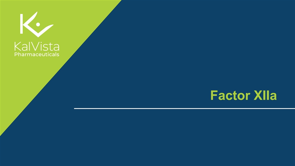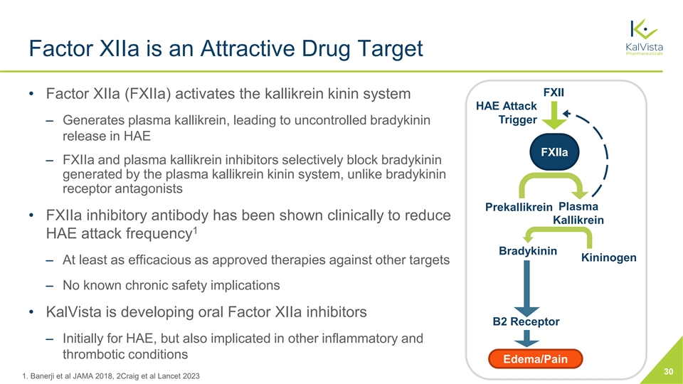 Factor XIIa is an Attractive Drug Target FXII • Factor XIIa (FXIIa) activates the kallikrein kinin system HAE Attack Trigger ‒ Generates plasma kallikrein, leading to uncontrolled bradykinin release in HAE FXIIa ‒ FXIIa and plasma kallikrein inhibitors selectively block bradykinin generated by the plasma kallikrein kinin system, unlike bradykinin receptor antagonists Plasma Prekallikrein • FXIIa inhibitory antibody has been shown clinically to reduce Kallikrein 1 HAE attack frequency Bradykinin Kininogen ‒ At least as efficacious as approved therapies against other targets ‒ No known chronic safety implications • KalVista is developing oral Factor XIIa inhibitors B2 Receptor ‒ Initially for HAE, but also implicated in other inflammatory and thrombotic conditions Edema/Pain 30 1. Banerji et al JAMA 2018, 2Craig et al Lancet 2023