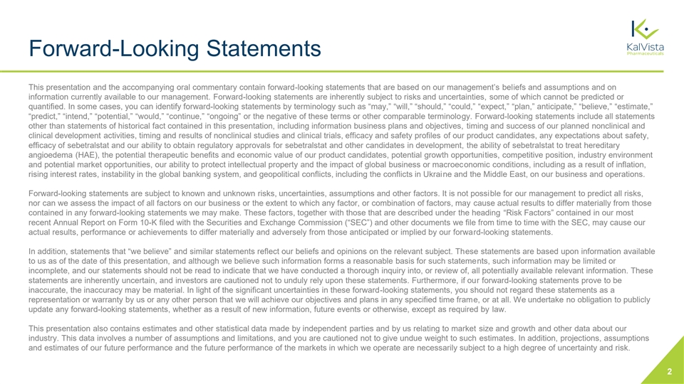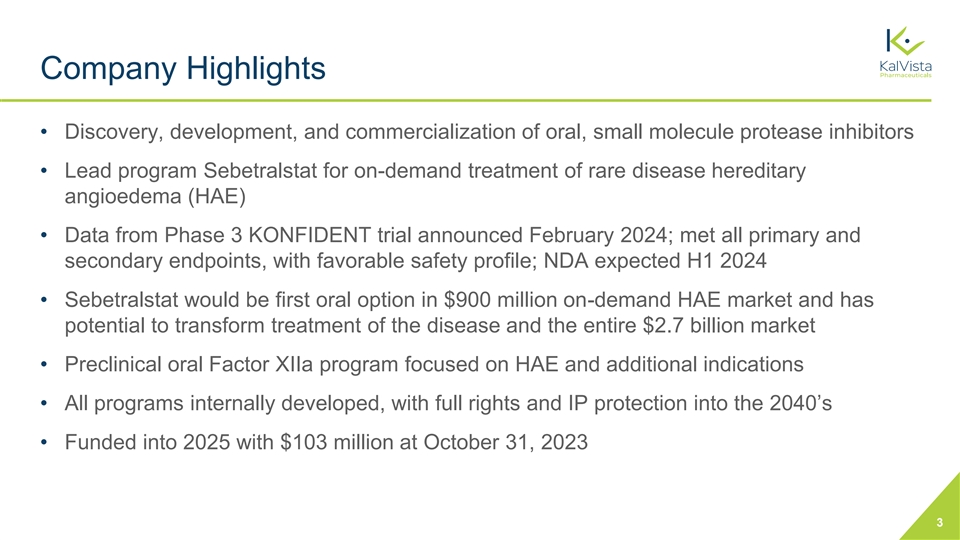 Forward-Looking Statements This presentation and the accompanying oral commentary contain forward-looking statements that are based on our management’s beliefs and assumptions and on information currently available to our management. Forward-looking statements are inherently subject to risks and uncertainties, some of which cannot be predicted or quantified. In some cases, you can identify forward-looking statements by terminology such as “may,” “will,” “should,” “could,” “expect,” “plan,” anticipate,” “believe,” “estimate,” “predict,” “intend,” “potential,” “would,” “continue,” “ongoing” or the negative of these terms or other comparable terminology. Forward-looking statements include all statements other than statements of historical fact contained in this presentation, including information business plans and objectives, timing and success of our planned nonclinical and clinical development activities, timing and results of nonclinical studies and clinical trials, efficacy and safety profiles of our product candidates, any expectations about safety, efficacy of sebetralstat and our ability to obtain regulatory approvals for sebetralstat and other candidates in development, the ability of sebetralstat to treat hereditary angioedema (HAE), the potential therapeutic benefits and economic value of our product candidates, potential growth opportunities, competitive position, industry environment and potential market opportunities, our ability to protect intellectual property and the impact of global business or macroeconomic conditions, including as a result of inflation, rising interest rates, instability in the global banking system, and geopolitical conflicts, including the conflicts in Ukraine and the Middle East, on our business and operations. Forward-looking statements are subject to known and unknown risks, uncertainties, assumptions and other factors. It is not possible for our management to predict all risks, nor can we assess the impact of all factors on our business or the extent to which any factor, or combination of factors, may cause actual results to differ materially from those contained in any forward-looking statements we may make. These factors, together with those that are described under the heading “Risk Factors” contained in our most recent Annual Report on Form 10-K filed with the Securities and Exchange Commission (“SEC”) and other documents we file from time to time with the SEC, may cause our actual results, performance or achievements to differ materially and adversely from those anticipated or implied by our forward-looking statements. In addition, statements that “we believe” and similar statements reflect our beliefs and opinions on the relevant subject. These statements are based upon information available to us as of the date of this presentation, and although we believe such information forms a reasonable basis for such statements, such information may be limited or incomplete, and our statements should not be read to indicate that we have conducted a thorough inquiry into, or review of, all potentially available relevant information. These statements are inherently uncertain, and investors are cautioned not to unduly rely upon these statements. Furthermore, if our forward-looking statements prove to be inaccurate, the inaccuracy may be material. In light of the significant uncertainties in these forward-looking statements, you should not regard these statements as a representation or warranty by us or any other person that we will achieve our objectives and plans in any specified time frame, or at all. We undertake no obligation to publicly update any forward-looking statements, whether as a result of new information, future events or otherwise, except as required by law. This presentation also contains estimates and other statistical data made by independent parties and by us relating to market size and growth and other data about our industry. This data involves a number of assumptions and limitations, and you are cautioned not to give undue weight to such estimates. In addition, projections, assumptions and estimates of our future performance and the future performance of the markets in which we operate are necessarily subject to a high degree of uncertainty and risk. 2