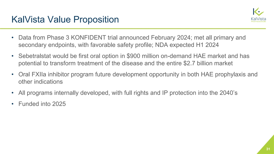 KalVista Value Proposition • Data from Phase 3 KONFIDENT trial announced February 2024; met all primary and secondary endpoints, with favorable safety profile; NDA expected H1 2024 • Sebetralstat would be first oral option in $900 million on-demand HAE market and has potential to transform treatment of the disease and the entire $2.7 billion market • Oral FXIIa inhibitor program future development opportunity in both HAE prophylaxis and other indications • All programs internally developed, with full rights and IP protection into the 2040’s • Funded into 2025 31
