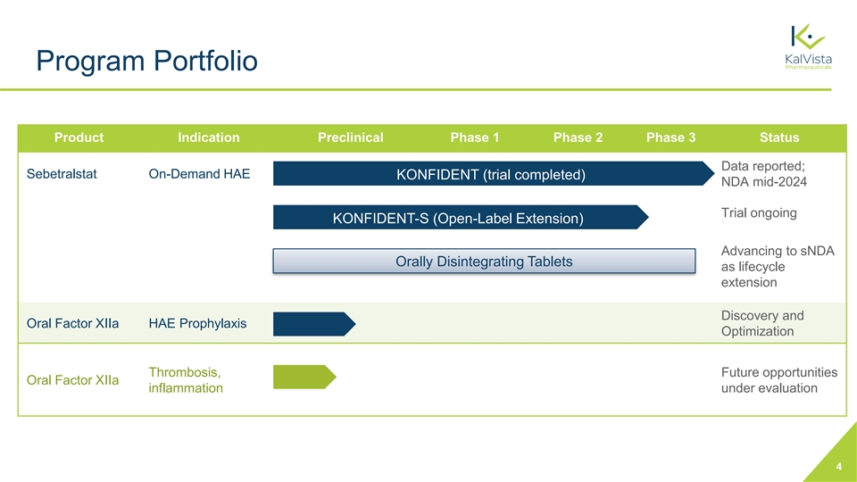 Company Highlights • Discovery, development, and commercialization of oral, small molecule protease inhibitors • Lead program Sebetralstat for on-demand treatment of rare disease hereditary angioedema (HAE) • Data from Phase 3 KONFIDENT trial announced February 2024; met all primary and secondary endpoints, with favorable safety profile; NDA expected H1 2024 • Sebetralstat would be first oral option in $900 million on-demand HAE market and has potential to transform treatment of the disease and the entire $2.7 billion market • Preclinical oral Factor XIIa program focused on HAE and additional indications • All programs internally developed, with full rights and IP protection into the 2040’s • Funded into 2025 with $103 million at October 31, 2023 3
