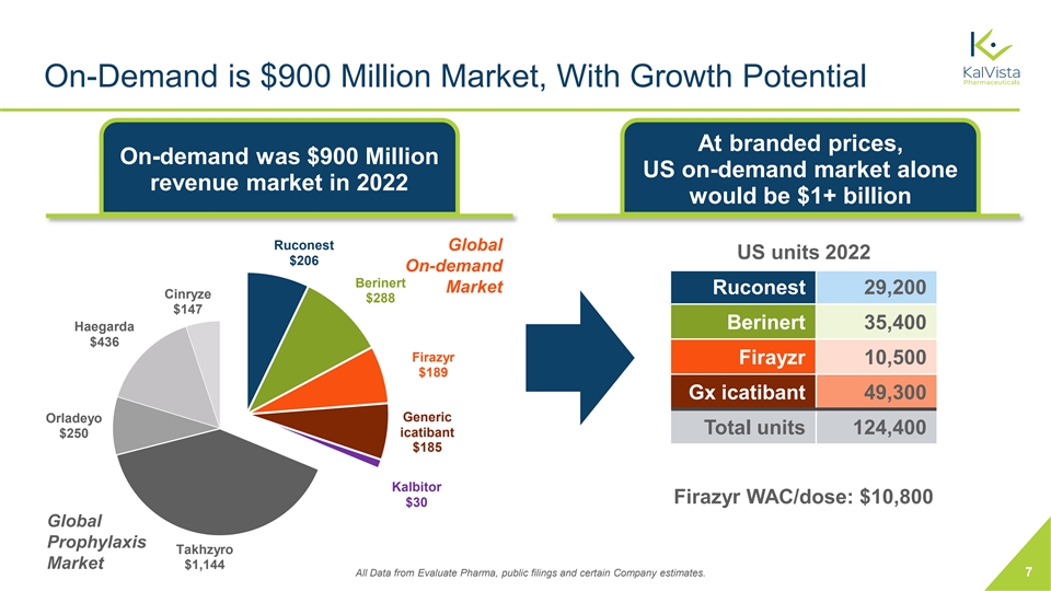 Hereditary Angioedema (HAE) • Genetic condition causing painful and pronounced swelling in various parts of the body ‒ Primarily caused by defect in C1 inhibitor activity, which leads to uncontrolled plasma kallikrein activation and bradykinin release 1 • Orphan disease: incidence 1 in 10,000 to 1 in 50,000 ‒ 6,500 – 8,000 patients in US; similar in EU ‒ Incidence consistent worldwide; patients have average of ~2 attacks per month • Approved on-demand therapies are injected or infused - high unmet need for efficacious and safe oral administration ‒ On-demand + prophylaxis is majority share in US, although burden of treatment remains high ‒ On-demand only is majority share ex-US 1 www.haei.org 6