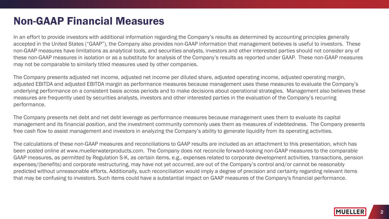 2 Non-GAAP Financial Measures In an effort to provide investors with additional information regarding the Company’s results as determined by accounting principles generally accepted in the United States (“GAAP”), the Company also provides non-GAAP information that management believes is useful to investors. These non-GAAP measures have limitations as analytical tools, and securities analysts, investors and other interested parties should not consider any of these non-GAAP measures in isolation or as a substitute for analysis of the Company’s results as reported under GAAP. These non-GAAP measures may not be comparable to similarly titled measures used by other companies. The Company presents adjusted net income, adjusted net income per diluted share, adjusted operating income, adjusted operating margin, adjusted EBITDA and adjusted EBITDA margin as performance measures because management uses these measures to evaluate the Company’s underlying performance on a consistent basis across periods and to make decisions about operational strategies. Management also believes these measures are frequently used by securities analysts, investors and other interested parties in the evaluation of the Company’s recurring performance. The Company presents net debt and net debt leverage as performance measures because management uses them to evaluate its capital management and its financial position, and the investment community commonly uses them as measures of indebtedness. The Company presents free cash flow to assist management and investors in analyzing the Company’s ability to generate liquidity from its operating activities. The calculations of these non-GAAP measures and reconciliations to GAAP results are included as an attachment to this presentation, which has been posted online at www.muellerwaterproducts.com. The Company does not reconcile forward-looking non-GAAP measures to the comparable GAAP measures, as permitted by Regulation S-K, as certain items, e.g., expenses related to corporate development activities, transactions, pension expenses/(benefits) and corporate restructuring, may have not yet occurred, are out of the Company’s control and/or cannot be reasonably predicted without unreasonable efforts. Additionally, such reconciliation would imply a degree of precision and certainty regarding relevant items that may be confusing to investors. Such items could have a substantial impact on GAAP measures of the Company's financial performance.