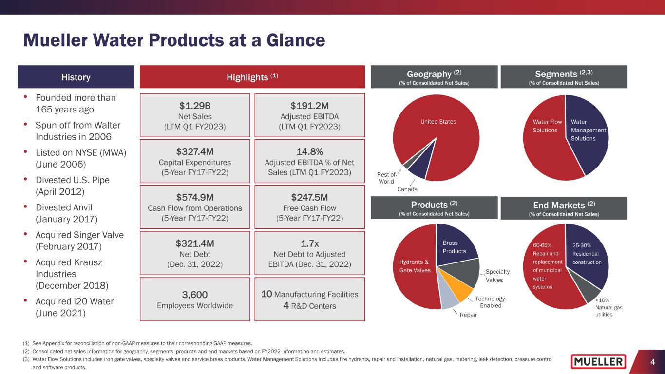3 Forward-Looking Statements This presentation contains certain statements that may be deemed “forward-looking statements” within the meaning of the federal securities laws. All statements that address activities, events or developments that the Company intends, expects, plans, projects, believes or anticipates will or may occur in the future are forward- looking statements, including, without limitation, statements regarding outlooks, projections, forecasts, expectations, commitments, trend descriptions and the ability to capitalize on trends, value creation, Board and committee composition plans, long-term strategies and the execution or acceleration thereof, operational improvements and excellence, the benefits of capital investments, financial or operating performance including improving sales growth and driving increased margins, capital allocation and growth strategy plans, positioning the Company’s product portfolio and the demand for the Company’s products. Forward-looking statements are based on certain assumptions and assessments made by the Company in light of the Company’s experience and perception of historical trends, current conditions and expected future developments. Actual results and the timing of events may differ materially from those contemplated by the forward-looking statements due to a number of factors, without limitation, including the future impact of the COVID-19 pandemic on the Company’s operations and results, including effects on the financial health of customers (including collections); logistical challenges and supply chain disruptions, geopolitical conditions, or other events; an inability to realize the anticipated benefits from our operational initiatives, including our large capital investments in Chattanooga and Kimball, Tennessee, and Decatur, Illinois, plant closures, and our reorganization and related strategic realignment activities; an inability to attract or retain a skilled and diverse workforce, increased competition related to the workforce and labor markets; an inability to protect the Company’s information systems against service interruption, misappropriation of data or breaches of security; failure to comply with personal data protection and privacy laws; cyclical and changing demand in core markets such as municipal spending, residential construction, and natural gas distribution; government monetary or fiscal policies; the impact of adverse weather conditions; the impact of manufacturing and product performance; the impact of wage, commodity and materials price inflation; the impact of warranty claims; an inability to successfully resolve significant legal proceedings or government investigations; compliance with environmental, trade and anti-corruption laws and regulations; climate change and legal or regulatory responses thereto; changing regulatory, trade and tariff conditions; the failure to integrate and/or realize any of the anticipated benefits of recent acquisitions or divestitures; an inability to achieve some or all of our Environmental, Social, and Governance goals; and other factors that are described in the section entitled “RISK FACTORS” in Item 1A of the Company’s most recent Annual Report on Form 10-K and later filings on Form 10-Q, as applicable. Forward-looking statements do not guarantee future performance and are only as of the date they are made. The Company undertakes no duty to update its forward-looking statements except as required by law. Undue reliance should not be placed on any forward-looking statements. You are advised to review any further disclosures the Company makes on related subjects in subsequent Forms 10-K, 10-Q, 8-K and other reports filed with the U.S. Securities and Exchange Commission.