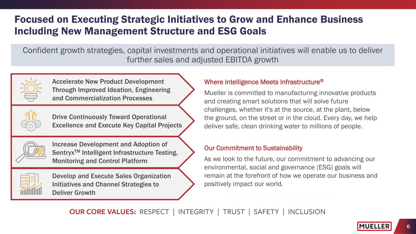 5 • Leading brand and municipal market specification positions with large installed base • Comprehensive distribution network and strong end-user relationships with end-markets served by limited number of suppliers • Low-cost manufacturing operations using lost foam process • Favorable market dynamics in municipal and residential end-markets • Aging infrastructure accelerating need for investment, estimated at $1.7 trillion according to the American Water Works Association, with $55 billion of new funding included in the federal infrastructure bill to upgrade drinking water and wastewater infrastructure (1) • Enhanced operational excellence initiatives delivering ongoing productivity improvements • Prioritizing capital investments to modernize manufacturing facilities, equipment and processes to drive margin expansion and continued investment in product development • Expanding capabilities for American-made products and advancing sustainability initiatives • Potential adoption of technology-enabled products by water utilities to actively diagnose, monitor and control the delivery of drinking water • Proprietary fixed leak detection, pipe condition assessment, smart metering and software offerings for utilities to have flexible and scalable platform for infrastructure monitoring • Flexible balance sheet with 1.7x net debt leverage and ample liquidity with $288.0 million available • Enabling growth through capital investments and acquisitions, while historically returning cash to shareholders through dividends and share repurchases LONG-TERM END MARKET DYNAMICS SUPPORTED BY ACCELERATION OF CHALLENGES FACING WATER INFRASTRUCTURE ACCELERATING PRODUCT DEVELOPMENT AND LEVERAGING STRENGTHS TO INCREASE TECHNOLOGY-ENABLED PRODUCTS MODERNIZING MANUFACTURING AND DRIVING OPERATIONAL EXCELLENCE TO DELIVER GROSS MARGIN EXPANSION STRONG, FLEXIBLE BALANCE SHEET AND GROWING FREE CASH FLOW WITH AMPLE LIQUIDITY STRONG COMPETITIVE POSITION WITH BROAD PORTFOLIO OF PRODUCTS AND SOLUTIONS (1) American Water Works Association, Buried No Longer: Confronting America’s Water Infrastructure Challenge 2012 Investment Highlights