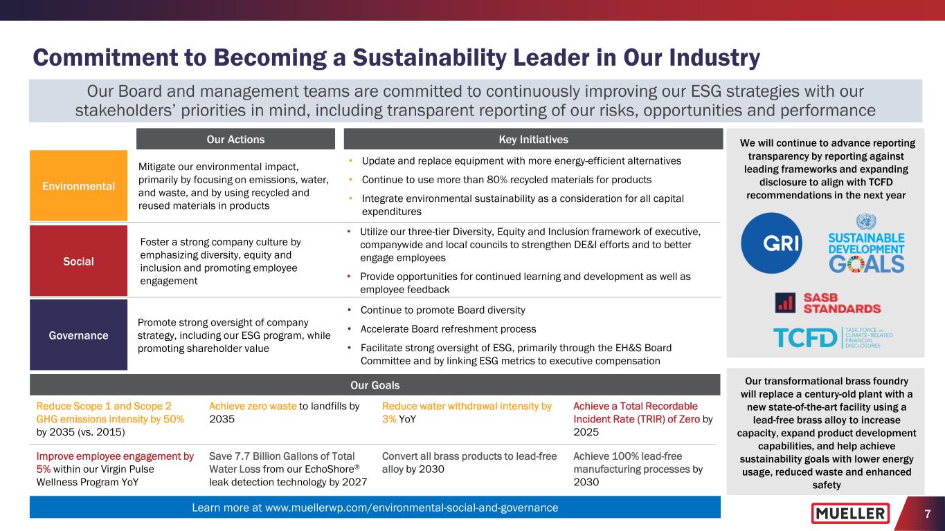 6 Focused on Executing Strategic Initiatives to Grow and Enhance Business Including New Management Structure and ESG Goals Confident growth strategies, capital investments and operational initiatives will enable us to deliver further sales and adjusted EBITDA growth Where Intelligence Meets Infrastructure® Mueller is committed to manufacturing innovative products and creating smart solutions that will solve future challenges, whether it's at the source, at the plant, below the ground, on the street or in the cloud. Every day, we help deliver safe, clean drinking water to millions of people. Our Commitment to Sustainability As we look to the future, our commitment to advancing our environmental, social and governance (ESG) goals will remain at the forefront of how we operate our business and positively impact our world. Accelerate New Product Development Through Improved Ideation, Engineering and Commercialization Processes Drive Continuously Toward Operational Excellence and Execute Key Capital Projects Increase Development and Adoption of SentryxTM Intelligent Infrastructure Testing, Monitoring and Control Platform Develop and Execute Sales Organization Initiatives and Channel Strategies to Deliver Growth