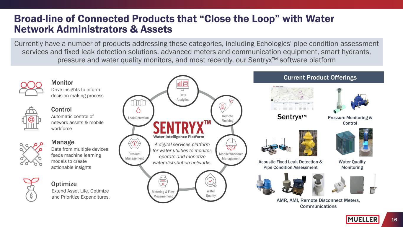 15 Need for Digital Water Solutions Expected to Accelerate Climate Change, Population Growth and Water Scarcity • Aging workforce and anticipated retirements rated as one of the top challenges facing utilities projected to see significant retirements over the next ten years (8) • Increasing consumer awareness and demand for water quality and usage information • Double-digit growth expected for emerging IoT and analytics solutions in areas like optimization, data integration, and strategic asset management (1) (1) Bluefield Research, June 2022, “The Digital Water Revolution: Global Digital Water Market Forecast, 2022 - 2030.” (2) Bluefield Research,2019, Water Industry 4.0 Focus Report. (3) EPA Aging Water Infrastructure Research Program. (4) “Water Main Break Rates in the USA and Canada: A Comprehensive Study,” March 2018, Steven Folkman at Utah State University. “Between 2012 and 2018, overall water main break rates increased by 27% from 11.0 to 14.0 breaks/(100 miles)/year. (5) Bluefield Research, February 2022, “U.S. Water & Sewer Pipe Network Infrastructure: Market Trends and Forecasts, 2022 – 2030.” (6) National Resource Defense Council. (7) U.S. Drought Monitor as of February 14, 2023 (includes contiguous 48 states). (8) American Water Works Association, “2022 State of the Water Industry Report.” • Increased frequency of extreme climate events elevating importance of infrastructure resiliency and water management with 57% of U.S. experiencing drought or abnormally dry conditions (7) • Population growth and migration trends leading to increased demand in suburban/rural areas (1) • Water scarcity awareness has increased conservation and use of low-flow appliances pressuring utility budgets, however additional resources will be needed to meet demand Aging Workforce, Consumer Awareness and Digitization Aging Infrastructure and Non-Revenue Water • Average age of water pipes has increased to 45 years in 2020 from 25 years in 1970 (2) • 240,000 water main breaks per year with 27% increase in break rates since 2012 (3,4) • Estimated that U.S. water utilities lose 5.5B gallons of drinking water per day due to pipe leakage and main breaks (5) • Growing number of states requiring water loss audits (6) “Bluefield projects that total global digital water spend will scale at an 8.8% CAGR through 2030 with approximately 25% of total global digital water spend in the U.S.” (1) Bluefield Research, June 2022