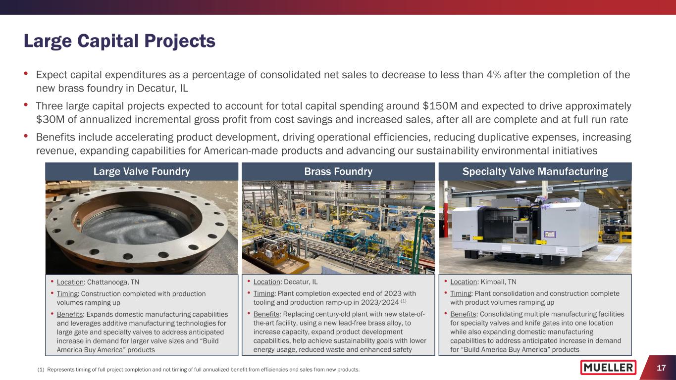 17 Large Capital Projects Large Valve Foundry Brass Foundry Specialty Valve Manufacturing • Expect capital expenditures as a percentage of consolidated net sales to decrease to less than 4% after the completion of the new brass foundry in Decatur, IL • Three large capital projects expected to account for total capital spending around $150M and expected to drive approximately $30M of annualized incremental gross profit from cost savings and increased sales, after all are complete and at full run rate • Benefits include accelerating product development, driving operational efficiencies, reducing duplicative expenses, increasing revenue, expanding capabilities for American-made products and advancing our sustainability environmental initiatives • Location: Chattanooga, TN • Timing: Construction completed with production volumes ramping up • Benefits: Expands domestic manufacturing capabilities and leverages additive manufacturing technologies for large gate and specialty valves to address anticipated increase in demand for larger valve sizes and “Build America Buy America” products • Location: Decatur, IL • Timing: Plant completion expected end of 2023 with tooling and production ramp-up in 2023/2024 (1) • Benefits: Replacing century-old plant with new state-of- the-art facility, using a new lead-free brass alloy, to increase capacity, expand product development capabilities, help achieve sustainability goals with lower energy usage, reduced waste and enhanced safety • Location: Kimball, TN • Timing: Plant consolidation and construction complete with product volumes ramping up • Benefits: Consolidating multiple manufacturing facilities for specialty valves and knife gates into one location while also expanding domestic manufacturing capabilities to address anticipated increase in demand for “Build America Buy America” products (1) Represents timing of full project completion and not timing of full annualized benefit from efficiencies and sales from new products.