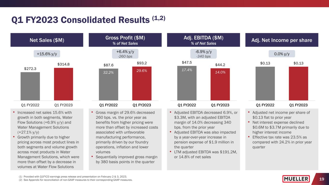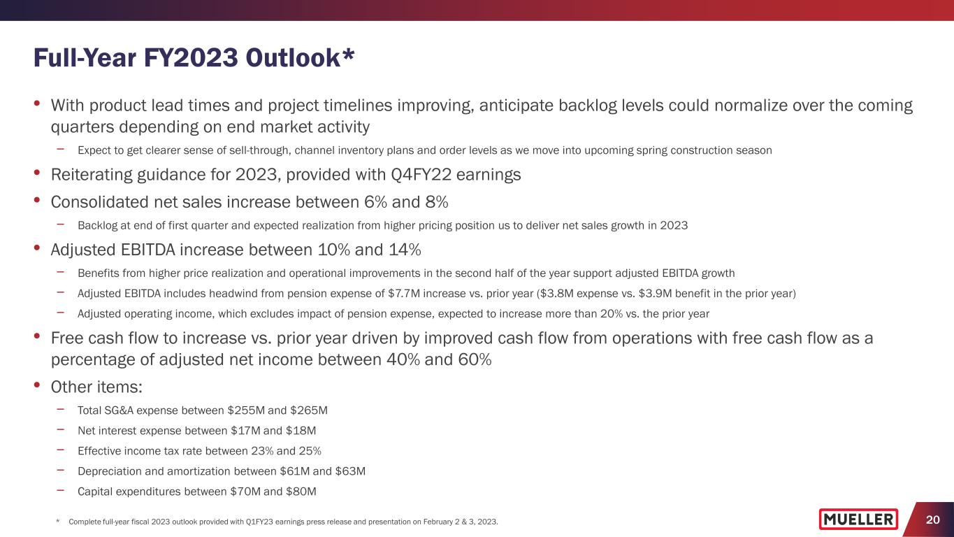 19 Q1 FY2023 Consolidated Results (1,2) (1) Provided with Q1FY23 earnings press release and presentation on February 2 & 3, 2023. (2) See Appendix for reconciliation of non-GAAP measures to their corresponding GAAP measures. • Increased net sales 15.6% with growth in both segments, Water Flow Solutions (+6.9% y/y) and Water Management Solutions (+27.1% y/y) • Growth primarily due to higher pricing across most product lines in both segments and volume growth across most products in Water Management Solutions, which were more than offset by a decrease in volumes at Water Flow Solutions • Gross margin of 29.6% decreased 260 bps. vs. the prior year as benefits from higher pricing were more than offset by increased costs associated with unfavorable manufacturing performance, primarily driven by our foundry operations, inflation and lower volumes • Sequentially improved gross margin by 380 basis points in the quarter • Adjusted EBITDA decreased 6.9%, or $3.3M, with an adjusted EBITDA margin of 14.0% decreasing 340 bps. from the prior year • Adjusted EBITDA was also impacted by a year-over-year increase in pension expense of $1.9 million in the quarter • LTM adjusted EBITDA was $191.2M, or 14.8% of net sales • Adjusted net income per share of $0.13 flat to prior year • Net interest expense declined $0.6M to $3.7M primarily due to higher interest income • Effective tax rate was 23.5% as compared with 24.2% in prior year quarter Adj. EBITDA ($M) % of Net Sales $47.5 $44.2 Q1 FY2022 Q1 FY2023 -6.9% y/y -340 bps Adj. Net Income per share $0.13 $0.13 Q1 FY2022 Q1 FY2023 0.0% y/y 17.4% 14.0% Gross Profit ($M) % of Net Sales $87.6 $93.2 Q1 FY2022 Q1 FY2023 +6.4% y/y -260 bps $272.3 $314.8 Q1 FY2022 Q1 FY2023 Net Sales ($M) +15.6% y/y 29.6%32.2%