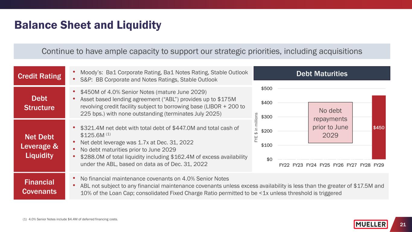 20 Full-Year FY2023 Outlook* • With product lead times and project timelines improving, anticipate backlog levels could normalize over the coming quarters depending on end market activity − Expect to get clearer sense of sell-through, channel inventory plans and order levels as we move into upcoming spring construction season • Reiterating guidance for 2023, provided with Q4FY22 earnings • Consolidated net sales increase between 6% and 8% − Backlog at end of first quarter and expected realization from higher pricing position us to deliver net sales growth in 2023 • Adjusted EBITDA increase between 10% and 14% − Benefits from higher price realization and operational improvements in the second half of the year support adjusted EBITDA growth − Adjusted EBITDA includes headwind from pension expense of $7.7M increase vs. prior year ($3.8M expense vs. $3.9M benefit in the prior year) − Adjusted operating income, which excludes impact of pension expense, expected to increase more than 20% vs. the prior year • Free cash flow to increase vs. prior year driven by improved cash flow from operations with free cash flow as a percentage of adjusted net income between 40% and 60% • Other items: − Total SG&A expense between $255M and $265M − Net interest expense between $17M and $18M − Effective income tax rate between 23% and 25% − Depreciation and amortization between $61M and $63M − Capital expenditures between $70M and $80M * Complete full-year fiscal 2023 outlook provided with Q1FY23 earnings press release and presentation on February 2 & 3, 2023.