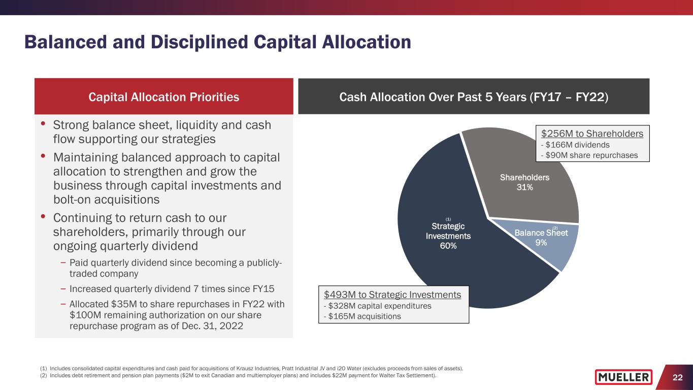 21 Balance Sheet and Liquidity Credit Rating Debt Structure Debt Maturities Financial Covenants • $450M of 4.0% Senior Notes (mature June 2029) • Asset based lending agreement (“ABL”) provides up to $175M revolving credit facility subject to borrowing base (LIBOR + 200 to 225 bps.) with none outstanding (terminates July 2025) • No financial maintenance covenants on 4.0% Senior Notes • ABL not subject to any financial maintenance covenants unless excess availability is less than the greater of $17.5M and 10% of the Loan Cap; consolidated Fixed Charge Ratio permitted to be <1x unless threshold is triggered Net Debt Leverage & Liquidity • $321.4M net debt with total debt of $447.0M and total cash of $125.6M (1) • Net debt leverage was 1.7x at Dec. 31, 2022 • No debt maturities prior to June 2029 • $288.0M of total liquidity including $162.4M of excess availability under the ABL, based on data as of Dec. 31, 2022 (1) 4.0% Senior Notes include $4.4M of deferred financing costs. $0 $0 $0 $0 $0 $0 $0 $450 $0 $100 $200 $300 $400 $500 FY22 FY23 FY24 FY25 FY26 FY27 FY28 FY29 FY E $ in m ill io ns No debt repayments prior to June 2029 Continue to have ample capacity to support our strategic priorities, including acquisitions • Moody’s: Ba1 Corporate Rating, Ba1 Notes Rating, Stable Outlook • S&P: BB Corporate and Notes Ratings, Stable Outlook