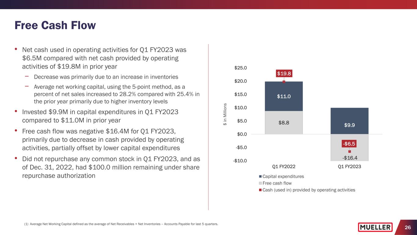 25 Historical Financial Performance • Over last five years (FY17 - FY22), delivered net sales and adjusted EBITDA CAGRs of 8.6% and 3.5%, respectively • Prior to pandemic (FY16 – FY19), delivered net sales and adjusted EBITDA CAGRs of 6.5% and 8.3%, respectively $801 $826 $916 $968 $964 $1,111 $1,247 $0 $200 $400 $600 $800 $1,000 $1,200 $1,400 FY16 FY17 FY18 FY19 FY20 FY21 FY22 Consolidated Net Sales $ in millions $156 $164 $180 $198 $191 $204 $195 $0 $50 $100 $150 $200 $250 FY16 FY17 FY18 FY19 FY20 FY21 FY22 Consolidated Adjusted EBITDA (1) $ in millions NOTE: See SEC Filings for Segment Results and Reconciliation of Non-GAAP to GAAP Performance Measures. (1) Adjusted EBITDA excludes other charges of $23.8M in FY16, $21.2M in FY17, $19.7M in FY18, $43.3M in FY19, $13.2M in FY20, $25.7M in FY21 and $18.5M in FY22.