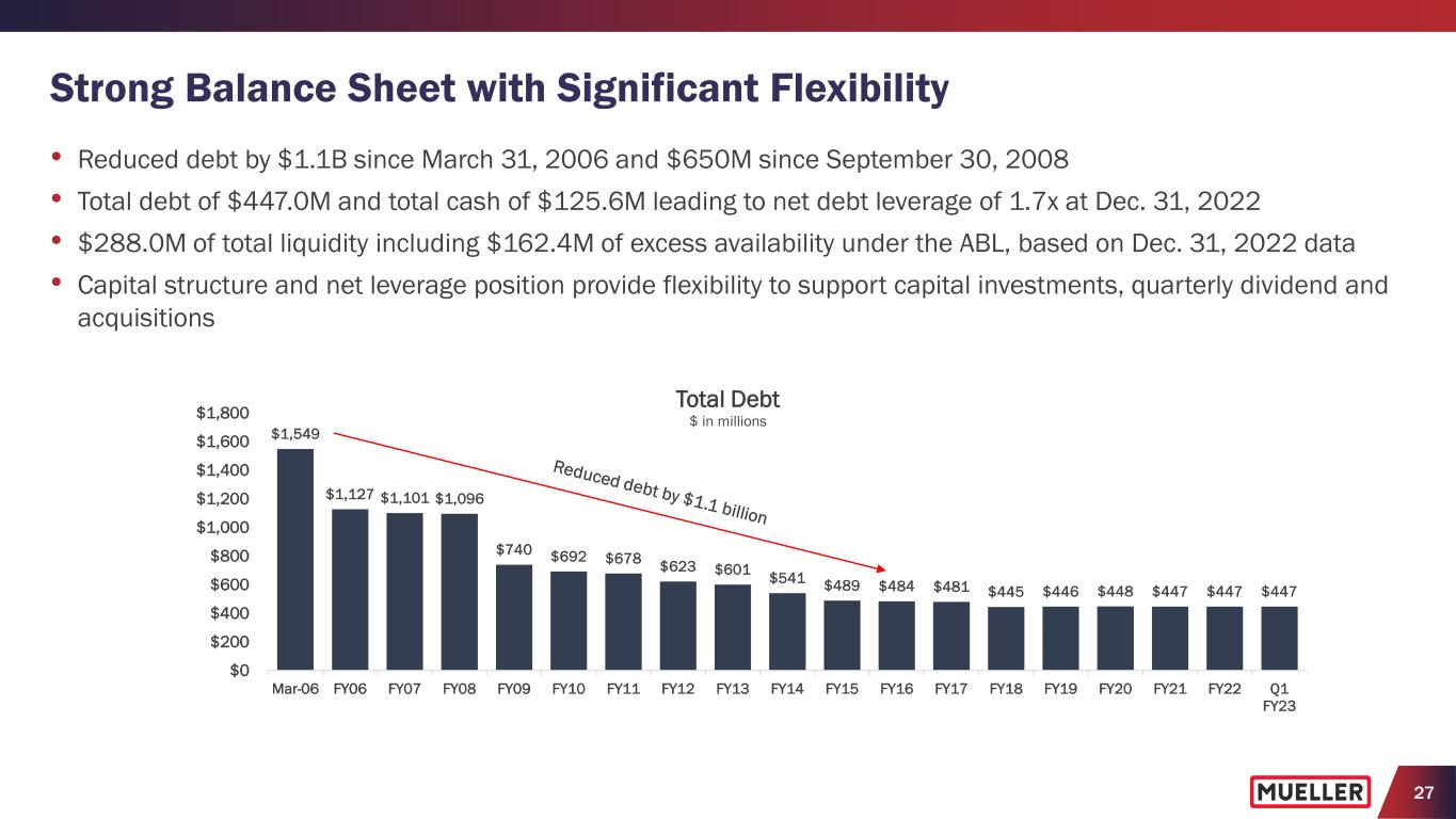 26 (1) Average Net Working Capital defined as the average of Net Receivables + Net Inventories – Accounts Payable for last 5 quarters. Free Cash Flow • Net cash used in operating activities for Q1 FY2023 was $6.5M compared with net cash provided by operating activities of $19.8M in prior year − Decrease was primarily due to an increase in inventories − Average net working capital, using the 5-point method, as a percent of net sales increased to 28.2% compared with 25.4% in the prior year primarily due to higher inventory levels • Invested $9.9M in capital expenditures in Q1 FY2023 compared to $11.0M in prior year • Free cash flow was negative $16.4M for Q1 FY2023, primarily due to decrease in cash provided by operating activities, partially offset by lower capital expenditures • Did not repurchase any common stock in Q1 FY2023, and as of Dec. 31, 2022, had $100.0 million remaining under share repurchase authorization $8.8 -$16.4 $11.0 $9.9 $19.8 -$6.5 -$10.0 -$5.0 $0.0 $5.0 $10.0 $15.0 $20.0 $25.0 Q1 FY2022 Q1 FY2023 $ in M ill io ns Capital expenditures Free cash flow Cash (used in) provided by operating activities