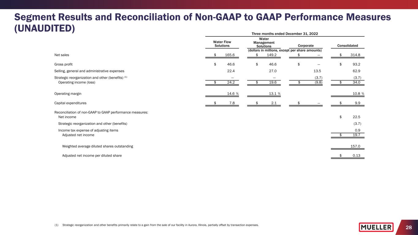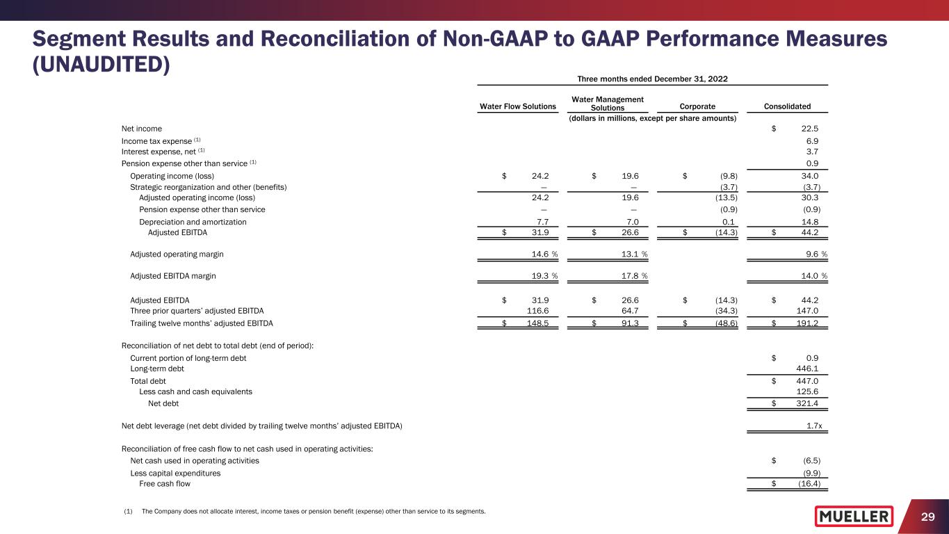 28 Segment Results and Reconciliation of Non-GAAP to GAAP Performance Measures (UNAUDITED) (1) Strategic reorganization and other benefits primarily relate to a gain from the sale of our facility in Aurora, Illinois, partially offset by transaction expenses. Three months ended December 31, 2022 Water Flow Solutions Water Management Solutions Corporate Consolidated (dollars in millions, except per share amounts) Net sales $ 165.6 $ 149.2 $ — $ 314.8 Gross profit $ 46.6 $ 46.6 $ — $ 93.2 Selling, general and administrative expenses 22.4 27.0 13.5 62.9 Strategic reorganization and other (benefits) (1) — — (3.7) (3.7) Operating income (loss) $ 24.2 $ 19.6 $ (9.8) $ 34.0 Operating margin 14.6 % 13.1 % 10.8 % Capital expenditures $ 7.8 $ 2.1 $ — $ 9.9 Reconciliation of non-GAAP to GAAP performance measures: Net income $ 22.5 Strategic reorganization and other (benefits) (3.7) Income tax expense of adjusting items 0.9 Adjusted net income $ 19.7 Weighted average diluted shares outstanding 157.0 Adjusted net income per diluted share $ 0.13