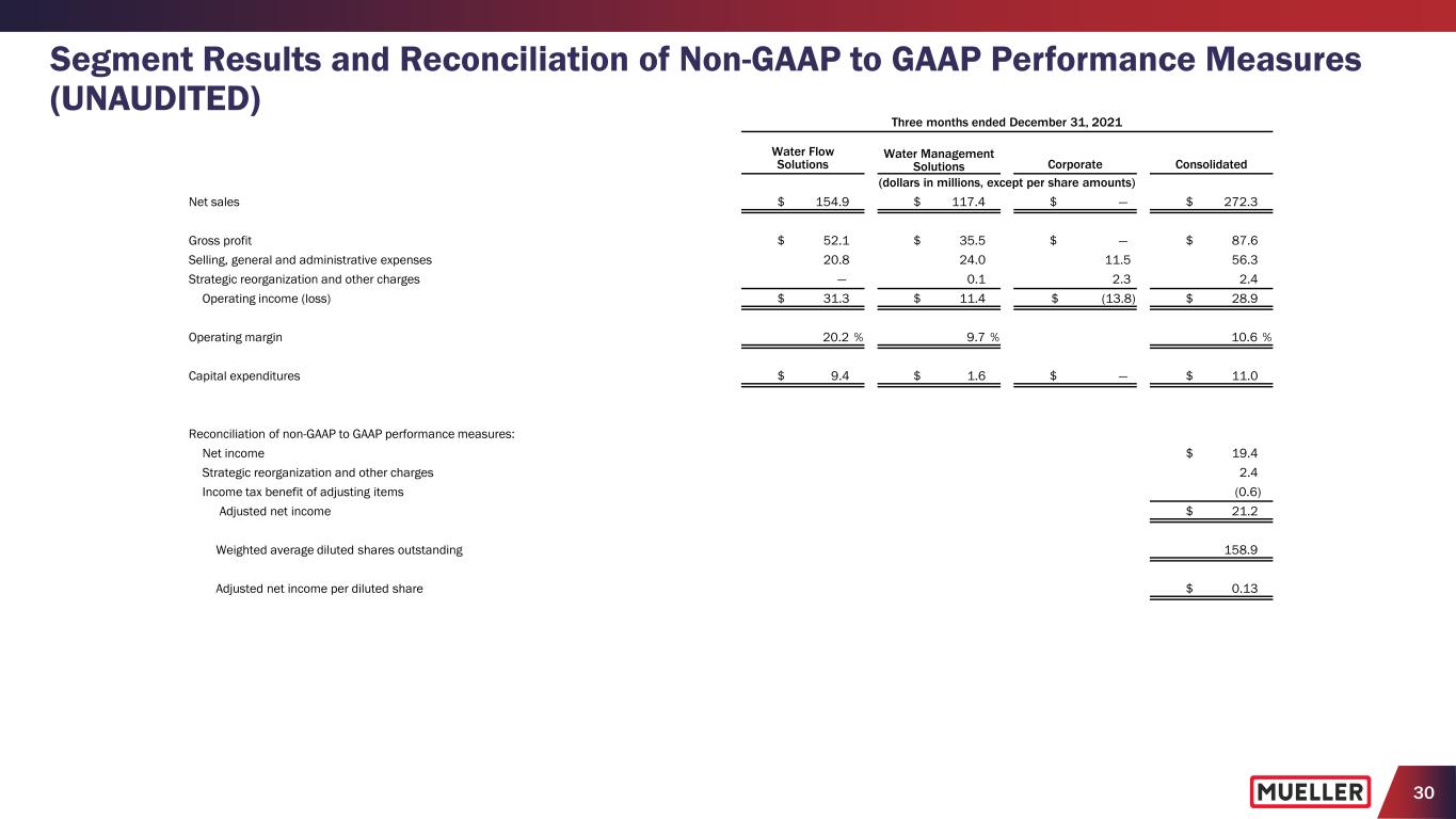 29 Segment Results and Reconciliation of Non-GAAP to GAAP Performance Measures (UNAUDITED) Three months ended December 31, 2022 Water Flow Solutions Water Management Solutions Corporate Consolidated (dollars in millions, except per share amounts) Net income $ 22.5 Income tax expense (1) 6.9 Interest expense, net (1) 3.7 Pension expense other than service (1) 0.9 Operating income (loss) $ 24.2 $ 19.6 $ (9.8) 34.0 Strategic reorganization and other (benefits) — — (3.7) (3.7) Adjusted operating income (loss) 24.2 19.6 (13.5) 30.3 Pension expense other than service — — (0.9) (0.9) Depreciation and amortization 7.7 7.0 0.1 14.8 Adjusted EBITDA $ 31.9 $ 26.6 $ (14.3) $ 44.2 Adjusted operating margin 14.6 % 13.1 % 9.6 % Adjusted EBITDA margin 19.3 % 17.8 % 14.0 % Adjusted EBITDA $ 31.9 $ 26.6 $ (14.3) $ 44.2 Three prior quarters’ adjusted EBITDA 116.6 64.7 (34.3) 147.0 Trailing twelve months’ adjusted EBITDA $ 148.5 $ 91.3 $ (48.6) $ 191.2 Reconciliation of net debt to total debt (end of period): Current portion of long-term debt $ 0.9 Long-term debt 446.1 Total debt $ 447.0 Less cash and cash equivalents 125.6 Net debt $ 321.4 Net debt leverage (net debt divided by trailing twelve months’ adjusted EBITDA) 1.7x Reconciliation of free cash flow to net cash used in operating activities: Net cash used in operating activities $ (6.5) Less capital expenditures (9.9) Free cash flow $ (16.4) (1) The Company does not allocate interest, income taxes or pension benefit (expense) other than service to its segments.