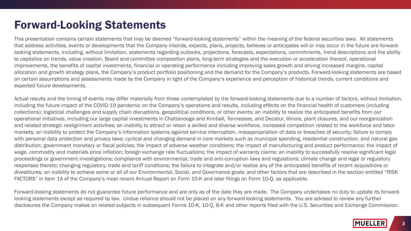 2 Non-GAAP Financial Measures In an effort to provide investors with additional information regarding the Company’s results as determined by accounting principles generally accepted in the United States (“GAAP”), the Company also provides non-GAAP information that management believes is useful to investors. These non-GAAP measures have limitations as analytical tools, and securities analysts, investors and other interested parties should not consider any of these non-GAAP measures in isolation or as a substitute for analysis of the Company’s results as reported under GAAP. These non-GAAP measures may not be comparable to similarly titled measures used by other companies. The Company presents adjusted net income, adjusted net income per diluted share, adjusted operating income, adjusted operating margin, adjusted EBITDA and adjusted EBITDA margin as performance measures because management uses these measures to evaluate the Company’s underlying performance on a consistent basis across periods and to make decisions about operational strategies. Management also believes these measures are frequently used by securities analysts, investors and other interested parties in the evaluation of the Company’s recurring performance. The Company presents net debt and net debt leverage as performance measures because management uses them to evaluate its capital management and financial position, and the investment community commonly uses them as measures of indebtedness. The Company presents free cash flow to assist management and investors in analyzing the Company’s ability to generate liquidity from its operating activities. The calculations of these non-GAAP measures and reconciliations to GAAP results are included as an attachment to this presentation, which has been posted online at www.muellerwaterproducts.com. The Company does not reconcile forward-looking non-GAAP measures to the comparable GAAP measures, as permitted by Regulation S-K, as certain items, e.g., expenses related to corporate development activities, transactions, pension expenses/(benefits) and corporate restructuring, may have not yet occurred, are out of the Company’s control and/or cannot be reasonably predicted without unreasonable efforts. Additionally, such reconciliation would imply a degree of precision and certainty regarding relevant items that may be confusing to investors. Such items could have a substantial impact on GAAP measures of the Company's financial performance.