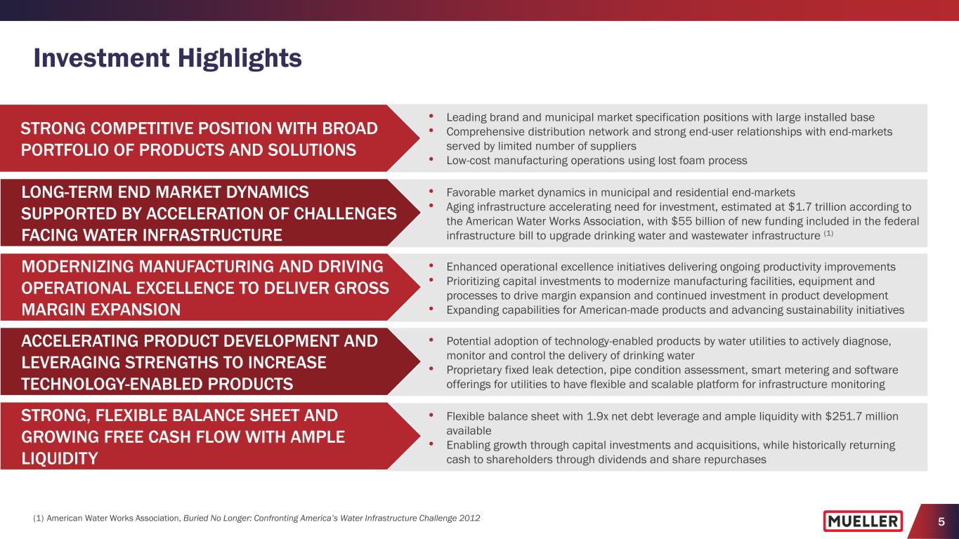 4 (1) See Appendix for reconciliation of non-GAAP measures to their corresponding GAAP measures. (2) Consolidated net sales Information for geography, segments, products and end markets based on FY2022 information and estimates. (3) Water Flow Solutions includes iron gate valves, specialty valves and service brass products. Water Management Solutions includes fire hydrants, repair and installation, natural gas, metering, leak detection, pressure control and software products. Water Flow Solutions Water Management Solutions United States Rest of World Geography (2) (% of Consolidated Net Sales) • Founded more than 165 years ago • Spun off from Walter Industries in 2006 • Listed on NYSE (MWA) (June 2006) • Divested U.S. Pipe (April 2012) • Divested Anvil (January 2017) • Acquired Singer Valve (February 2017) • Acquired Krausz Industries (December 2018) • Acquired i20 Water (June 2021) Segments (2,3) (% of Consolidated Net Sales) <10% Natural gas utilities 60-65% Repair and replacement of municipal water systems 25-30% Residential construction Brass Products Hydrants & Gate Valves Specialty Valves Technology- Enabled Products (2) (% of Consolidated Net Sales) End Markets (2) (% of Consolidated Net Sales) Canada History Highlights (1) $1.31B Net Sales (LTM Q2 FY2023) $188.7M Adjusted EBITDA (LTM Q2 FY2023) $327.4M Capital Expenditures (5-Year FY18-FY22) 14.4% Adjusted EBITDA % of Net Sales (LTM Q2 FY2023) $574.9M Cash Flow from Operations (5-Year FY18-FY22) $247.5M Free Cash Flow (5-Year FY18-FY22) $358.3M Net Debt (March 31, 2023) 1.9x Net Debt to Adjusted EBITDA (March 31, 2023) 3,600 Employees Worldwide 11 Manufacturing Facilities 5 R&D Centers Mueller Water Products at a Glance Repair