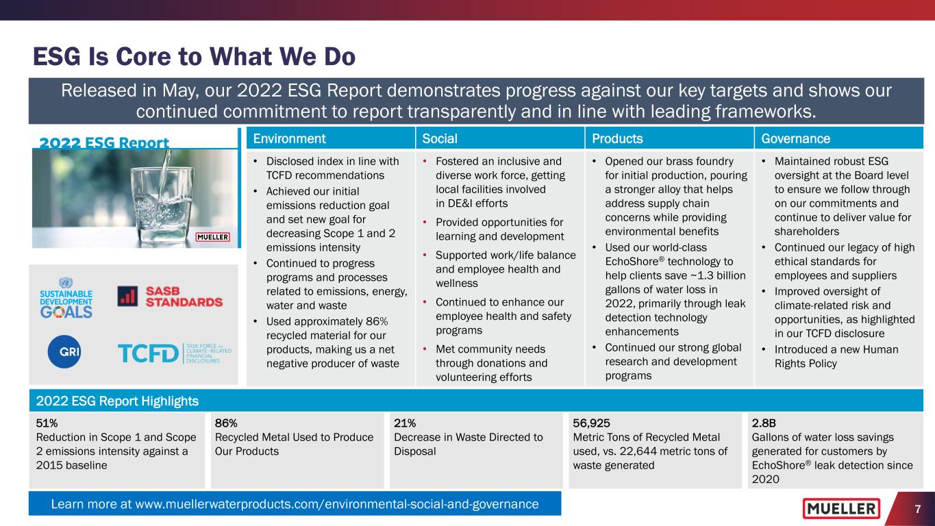 6 Focused on Executing Strategic Initiatives to Grow and Enhance Business Including New Management Structure and ESG Goals Confident growth strategies, capital investments and operational initiatives will enable us to deliver further sales and adjusted EBITDA growth Where Intelligence Meets Infrastructure® Mueller is committed to manufacturing innovative products and creating smart solutions that will solve future challenges, whether it's at the source, at the plant, below the ground, on the street or in the cloud. Every day, we help deliver safe, clean drinking water to millions of people. Our Commitment to Sustainability As we look to the future, our commitment to advancing our environmental, social and governance (ESG) goals will remain at the forefront of how we operate our business and positively impact our world. Accelerate New Product Development Through Improved Ideation, Engineering and Commercialization Processes Drive Continuously Toward Operational Excellence and Execute Key Capital Projects Increase Development and Adoption of SentryxTM Intelligent Infrastructure Testing, Monitoring and Control Platform Develop and Execute Sales Organization Initiatives and Channel Strategies to Deliver Growth