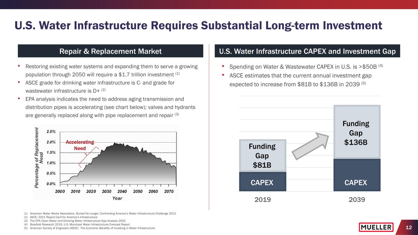 11 Water Utilities Are Facing Many Challenges • Unrealistic for U.S. water utilities and local governments to bridge the gap between their current capital spending and projected need for capital spending, based on the age and life expectancy of their infrastructure • Moving forward the industry will have to use multiple approaches to extend the life of their assets including measured allocation of capital funds, product innovation, predictive maintenance planning, and rate increases • Climate change is reducing both water availability and quality; solutions to retain, treat, and recycle water will need to be incorporated into investment and operating plans • Codification of contaminants regulation could accelerate innovation around testing for and removal of pollutants Aging Infrastructure Digitization Budget Pressures Aging Workforce Urbanization Population Shifts Water Utilities Implications for Utilities • Municipal repair and replacement remains a tailwind • More detailed customer segmentation is needed to market targeted points of differentiation to disparate users • Connecting infrastructure network to provide both predictive insight and mechanical functionality will enhance value proposition, thereby increasing adoption of products and services • Participating in training of the next generation of utility workers could be a competitive advantage • Web-enabled tools are needed to engage new generation of users • Alternative business models likely to become more attractive to utilities Implications for Mueller Regulation Climate