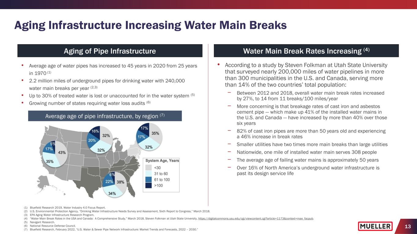 12 U.S. Water Infrastructure Requires Substantial Long-term Investment U.S. Water Infrastructure CAPEX and Investment GapRepair & Replacement Market (1) American Water Works Association, Buried No Longer: Confronting America’s Water Infrastructure Challenge 2012 (2) ASCE: 2021 Report Card for America’s Infrastructure (3) The EPA Clean Water and Drinking Water Infrastructure Gap Analysis 2002 (4) Bluefield Research 2019, U.S. Municipal Water Infrastructure Forecast Report (5) American Society of Engineers (ASCE): The Economic Benefits of Investing in Water Infrastructure • Restoring existing water systems and expanding them to serve a growing population through 2050 will require a $1.7 trillion investment (1) • ASCE grade for drinking water infrastructure is C- and grade for wastewater infrastructure is D+ (2) • EPA analysis indicates the need to address aging transmission and distribution pipes is accelerating (see chart below); valves and hydrants are generally replaced along with pipe replacement and repair (3) 2019 2039 • Spending on Water & Wastewater CAPEX in U.S. is >$50B (4) • ASCE estimates that the current annual investment gap expected to increase from $81B to $136B in 2039 (5) Accelerating Need Funding Gap $81B Funding Gap $136B CAPEX CAPEX