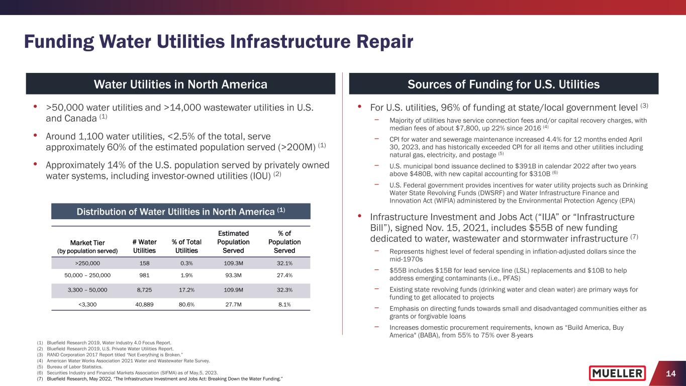 13 Aging Infrastructure Increasing Water Main Breaks (1) Bluefield Research 2019, Water Industry 4.0 Focus Report. (2) U.S. Environmental Protection Agency, “Drinking Water Infrastructure Needs Survey and Assessment, Sixth Report to Congress,” March 2018. (3) EPA Aging Water Infrastructure Research Program. (4) “Water Main Break Rates in the USA and Canada: A Comprehensive Study,” March 2018, Steven Folkman at Utah State University, https://digitalcommons.usu.edu/cgi/viewcontent.cgi?article=1173&context=mae_facpub. (5) Navigant Research. (6) National Resource Defense Council. (7) Bluefield Research, February 2022, “U.S. Water & Sewer Pipe Network Infrastructure: Market Trends and Forecasts, 2022 – 2030.” • Average age of water pipes has increased to 45 years in 2020 from 25 years in 1970 (1) • 2.2 million miles of underground pipes for drinking water with 240,000 water main breaks per year (2,3) • Up to 30% of treated water is lost or unaccounted for in the water system (5) • Growing number of states requiring water loss audits (6) Water Main Break Rates Increasing (4)Aging of Pipe Infrastructure • According to a study by Steven Folkman at Utah State University that surveyed nearly 200,000 miles of water pipelines in more than 300 municipalities in the U.S. and Canada, serving more than 14% of the two countries’ total population: − Between 2012 and 2018, overall water main break rates increased by 27%, to 14 from 11 breaks/100 miles/year − More concerning is that breakage rates of cast iron and asbestos cement pipe — which make up 41% of the installed water mains in the U.S. and Canada — have increased by more than 40% over those six years − 82% of cast iron pipes are more than 50 years old and experiencing a 46% increase in break rates − Smaller utilities have two times more main breaks than large utilities − Nationwide, one mile of installed water main serves 308 people − The average age of failing water mains is approximately 50 years − Over 16% of North America’s underground water infrastructure is past its design service life Average age of pipe infrastructure, by region (7)