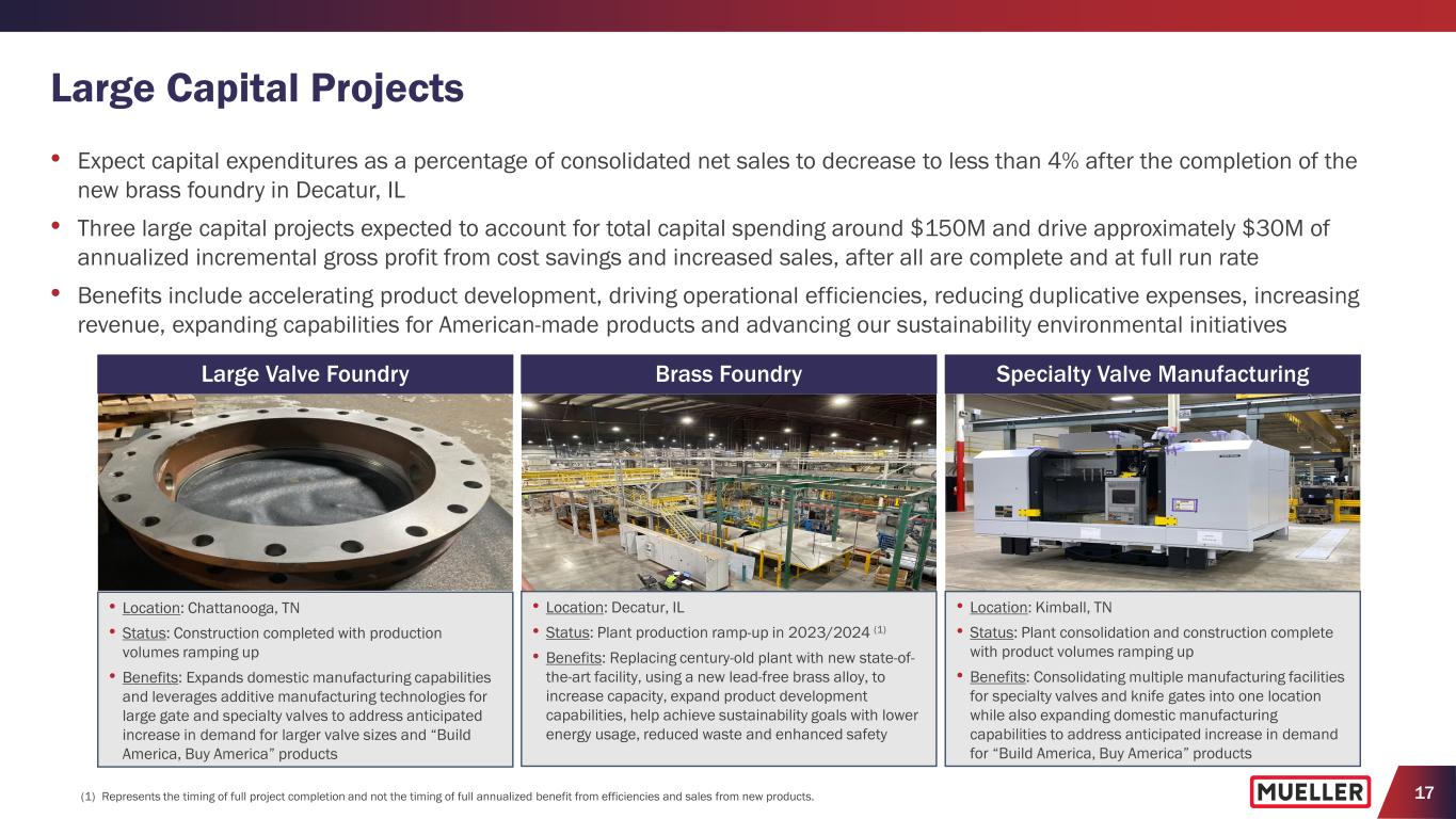 17 Large Capital Projects Large Valve Foundry Brass Foundry Specialty Valve Manufacturing • Expect capital expenditures as a percentage of consolidated net sales to decrease to less than 4% after the completion of the new brass foundry in Decatur, IL • Three large capital projects expected to account for total capital spending around $150M and drive approximately $30M of annualized incremental gross profit from cost savings and increased sales, after all are complete and at full run rate • Benefits include accelerating product development, driving operational efficiencies, reducing duplicative expenses, increasing revenue, expanding capabilities for American-made products and advancing our sustainability environmental initiatives • Location: Chattanooga, TN • Status: Construction completed with production volumes ramping up • Benefits: Expands domestic manufacturing capabilities and leverages additive manufacturing technologies for large gate and specialty valves to address anticipated increase in demand for larger valve sizes and “Build America, Buy America” products • Location: Decatur, IL • Status: Plant production ramp-up in 2023/2024 (1) • Benefits: Replacing century-old plant with new state-of- the-art facility, using a new lead-free brass alloy, to increase capacity, expand product development capabilities, help achieve sustainability goals with lower energy usage, reduced waste and enhanced safety • Location: Kimball, TN • Status: Plant consolidation and construction complete with product volumes ramping up • Benefits: Consolidating multiple manufacturing facilities for specialty valves and knife gates into one location while also expanding domestic manufacturing capabilities to address anticipated increase in demand for “Build America, Buy America” products (1) Represents the timing of full project completion and not the timing of full annualized benefit from efficiencies and sales from new products.