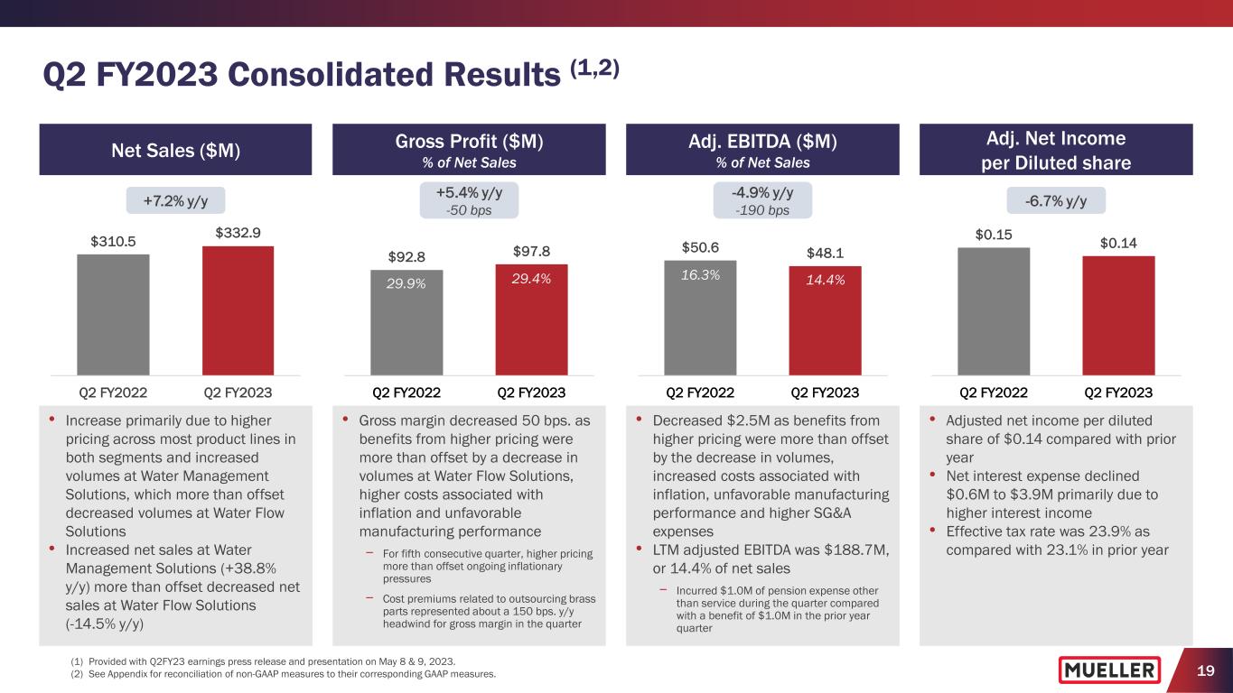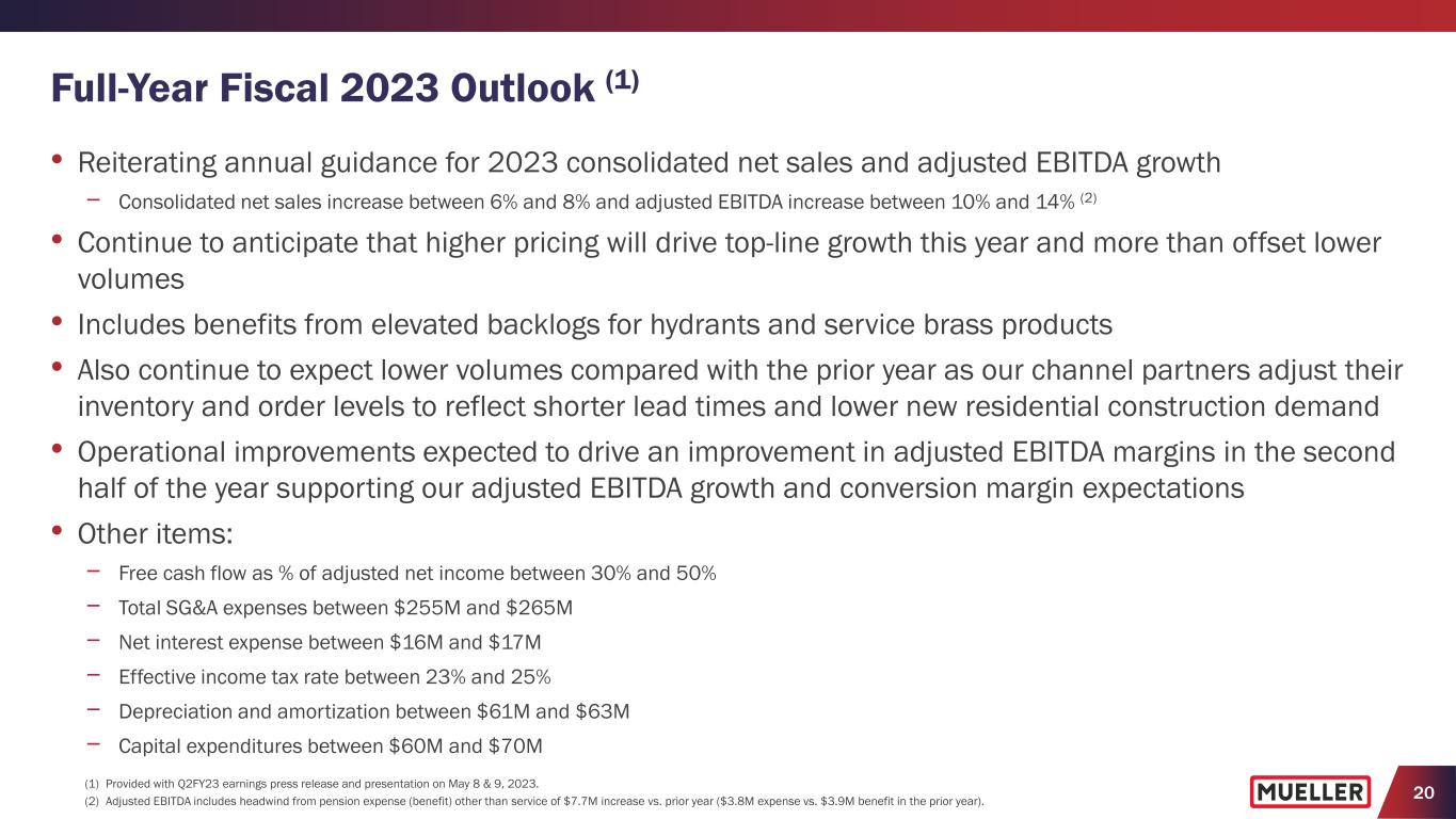 19 Q2 FY2023 Consolidated Results (1,2) (1) Provided with Q2FY23 earnings press release and presentation on May 8 & 9, 2023. (2) See Appendix for reconciliation of non-GAAP measures to their corresponding GAAP measures. • Increase primarily due to higher pricing across most product lines in both segments and increased volumes at Water Management Solutions, which more than offset decreased volumes at Water Flow Solutions • Increased net sales at Water Management Solutions (+38.8% y/y) more than offset decreased net sales at Water Flow Solutions (-14.5% y/y) • Gross margin decreased 50 bps. as benefits from higher pricing were more than offset by a decrease in volumes at Water Flow Solutions, higher costs associated with inflation and unfavorable manufacturing performance − For fifth consecutive quarter, higher pricing more than offset ongoing inflationary pressures − Cost premiums related to outsourcing brass parts represented about a 150 bps. y/y headwind for gross margin in the quarter • Decreased $2.5M as benefits from higher pricing were more than offset by the decrease in volumes, increased costs associated with inflation, unfavorable manufacturing performance and higher SG&A expenses • LTM adjusted EBITDA was $188.7M, or 14.4% of net sales − Incurred $1.0M of pension expense other than service during the quarter compared with a benefit of $1.0M in the prior year quarter • Adjusted net income per diluted share of $0.14 compared with prior year • Net interest expense declined $0.6M to $3.9M primarily due to higher interest income • Effective tax rate was 23.9% as compared with 23.1% in prior year Adj. EBITDA ($M) % of Net Sales $50.6 $48.1 Q2 FY2022 Q2 FY2023 -4.9% y/y -190 bps Adj. Net Income per Diluted share $0.15 $0.14 Q2 FY2022 Q2 FY2023 -6.7% y/y 16.3% 14.4% Gross Profit ($M) % of Net Sales $92.8 $97.8 Q2 FY2022 Q2 FY2023 +5.4% y/y -50 bps $310.5 $332.9 Q2 FY2022 Q2 FY2023 Net Sales ($M) +7.2% y/y 29.4%29.9%