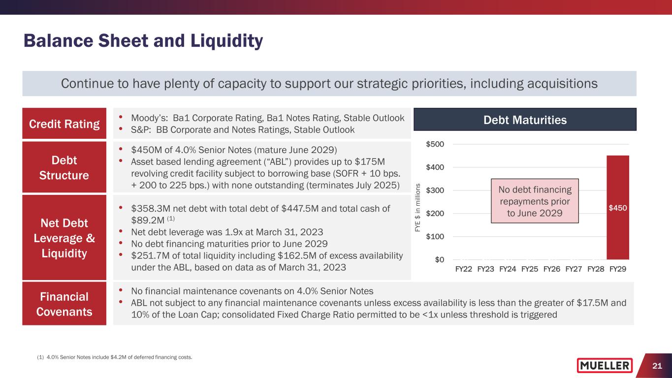 20 Full-Year Fiscal 2023 Outlook (1) • Reiterating annual guidance for 2023 consolidated net sales and adjusted EBITDA growth − Consolidated net sales increase between 6% and 8% and adjusted EBITDA increase between 10% and 14% (2) • Continue to anticipate that higher pricing will drive top-line growth this year and more than offset lower volumes • Includes benefits from elevated backlogs for hydrants and service brass products • Also continue to expect lower volumes compared with the prior year as our channel partners adjust their inventory and order levels to reflect shorter lead times and lower new residential construction demand • Operational improvements expected to drive an improvement in adjusted EBITDA margins in the second half of the year supporting our adjusted EBITDA growth and conversion margin expectations • Other items: − Free cash flow as % of adjusted net income between 30% and 50% − Total SG&A expenses between $255M and $265M − Net interest expense between $16M and $17M − Effective income tax rate between 23% and 25% − Depreciation and amortization between $61M and $63M − Capital expenditures between $60M and $70M (1) Provided with Q2FY23 earnings press release and presentation on May 8 & 9, 2023. (2) Adjusted EBITDA includes headwind from pension expense (benefit) other than service of $7.7M increase vs. prior year ($3.8M expense vs. $3.9M benefit in the prior year).