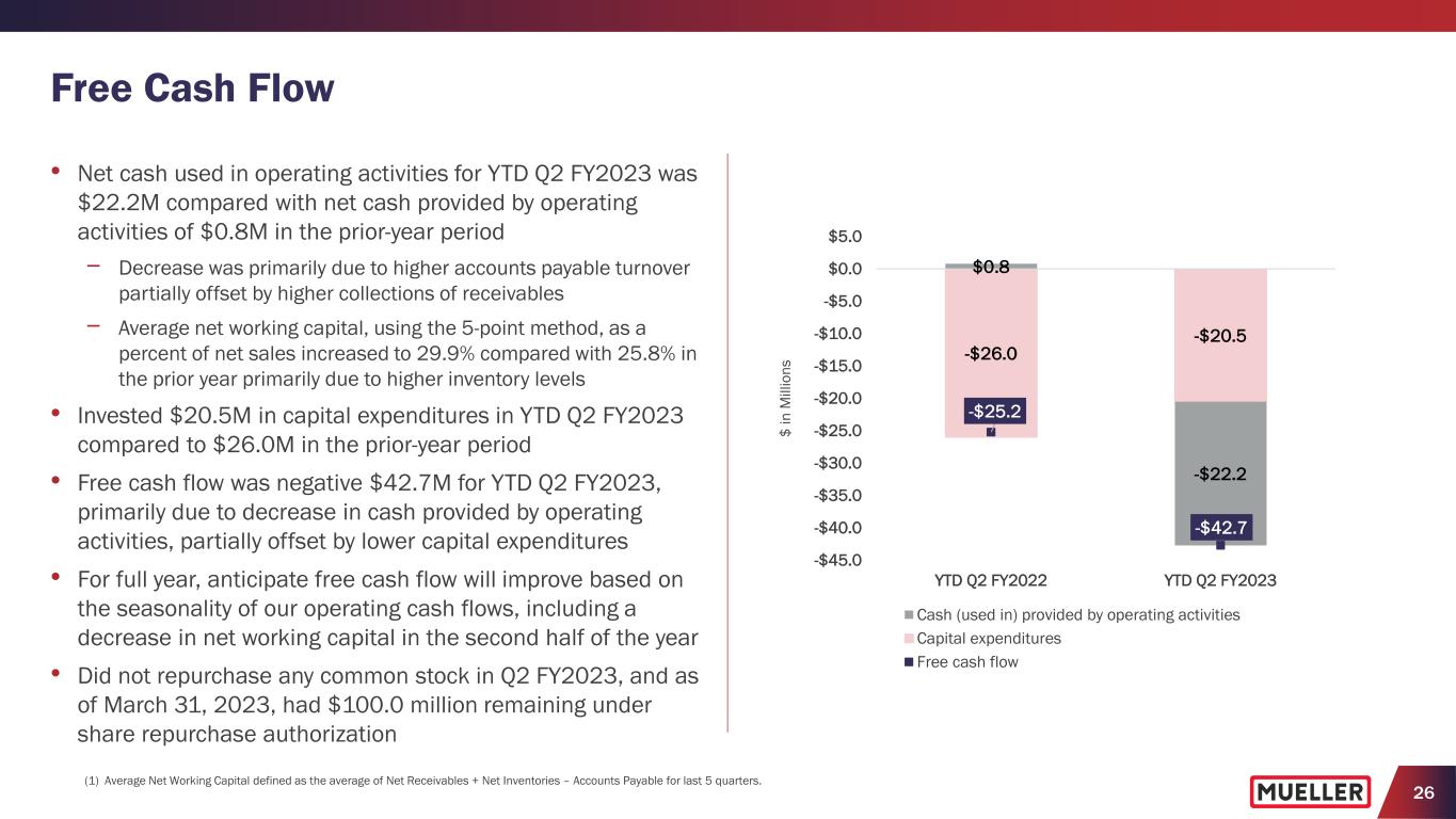 25 Historical Financial Performance • Over last five years (FY18 - FY22), delivered net sales and adjusted EBITDA CAGRs of 8.6% and 3.5%, respectively • Prior to pandemic (FY17 – FY19), delivered net sales and adjusted EBITDA CAGRs of 6.5% and 8.3%, respectively $801 $826 $916 $968 $964 $1,111 $1,247 $0 $200 $400 $600 $800 $1,000 $1,200 $1,400 FY16 FY17 FY18 FY19 FY20 FY21 FY22 Consolidated Net Sales $ in millions $156 $164 $180 $198 $191 $204 $195 $0 $50 $100 $150 $200 $250 FY16 FY17 FY18 FY19 FY20 FY21 FY22 Consolidated Adjusted EBITDA (1) $ in millions NOTE: See SEC Filings for Segment Results and Reconciliation of Non-GAAP to GAAP Performance Measures. (1) Adjusted EBITDA excludes other charges of $23.8M in FY16, $21.2M in FY17, $19.7M in FY18, $43.3M in FY19, $13.2M in FY20, $25.7M in FY21 and $18.5M in FY22.
