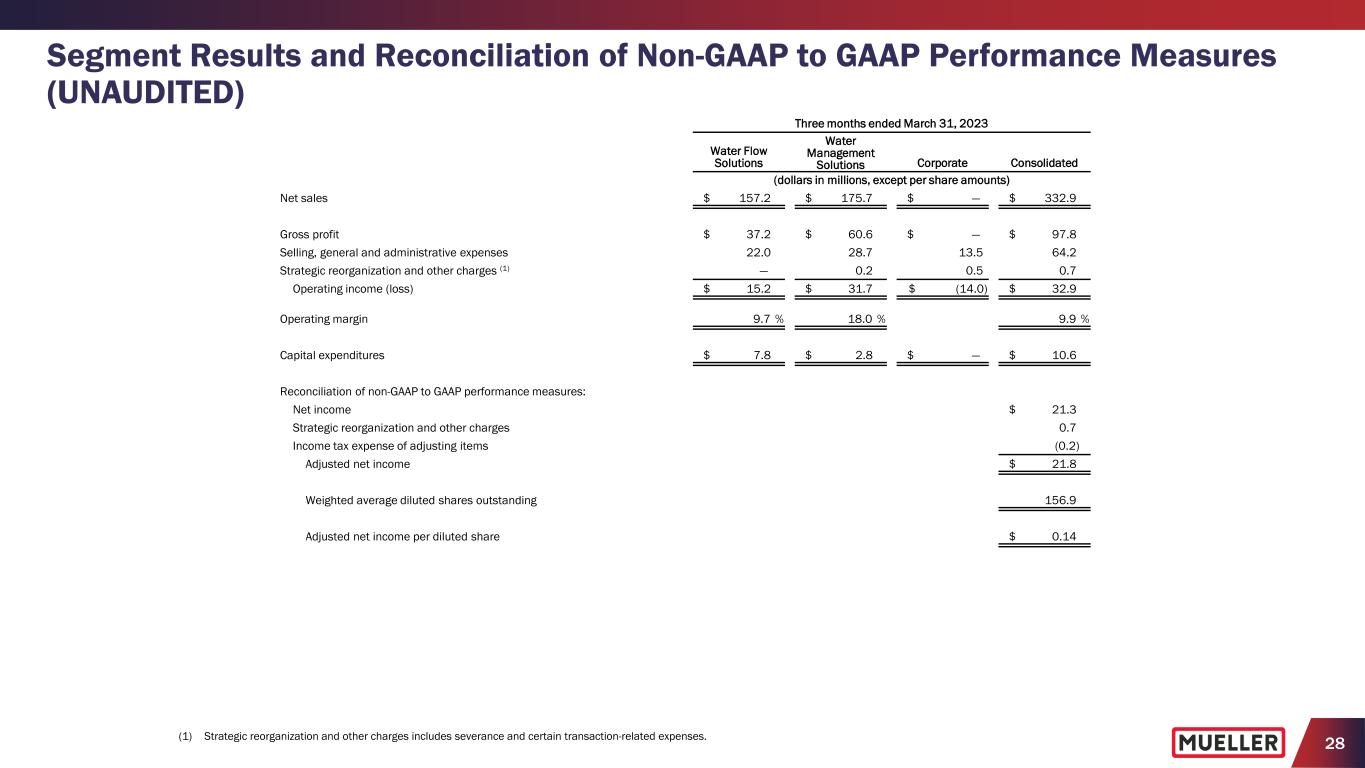28 Segment Results and Reconciliation of Non-GAAP to GAAP Performance Measures (UNAUDITED) (1) Strategic reorganization and other charges includes severance and certain transaction-related expenses. Three months ended March 31, 2023 Water Flow Solutions Water Management Solutions Corporate Consolidated (dollars in millions, except per share amounts) Net sales $ 157.2 $ 175.7 $ — $ 332.9 Gross profit $ 37.2 $ 60.6 $ — $ 97.8 Selling, general and administrative expenses 22.0 28.7 13.5 64.2 Strategic reorganization and other charges (1) — 0.2 0.5 0.7 Operating income (loss) $ 15.2 $ 31.7 $ (14.0) $ 32.9 Operating margin 9.7 % 18.0 % 9.9 % Capital expenditures $ 7.8 $ 2.8 $ — $ 10.6 Reconciliation of non-GAAP to GAAP performance measures: Net income $ 21.3 Strategic reorganization and other charges 0.7 Income tax expense of adjusting items (0.2) Adjusted net income $ 21.8 Weighted average diluted shares outstanding 156.9 Adjusted net income per diluted share $ 0.14