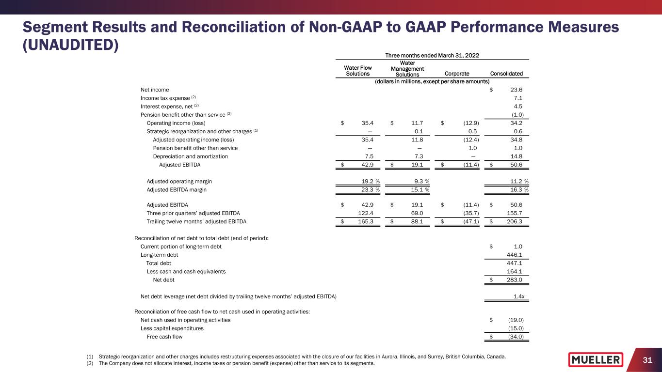 29 Segment Results and Reconciliation of Non-GAAP to GAAP Performance Measures (UNAUDITED) (1) Strategic reorganization and other charges includes severance and certain transaction-related expenses. (2) The Company does not allocate interest, income taxes or pension benefit (expense) other than service to its segments. Three months ended March 31, 2023 Water Flow Solutions Water Management Solutions Corporate Consolidated (dollars in millions, except per share amounts) Net income $ 21.3 Income tax expense (2) 6.7 Interest expense, net (2) 3.9 Pension expense other than service (2) 1.0 Operating income (loss) $ 15.2 $ 31.7 $ (14.0) 32.9 Strategic reorganization and other charges (1) — 0.2 0.5 0.7 Adjusted operating income (loss) 15.2 31.9 (13.5) 33.6 Pension expense other than service — — (1.0) (1.0) Depreciation and amortization 7.8 7.7 — 15.5 Adjusted EBITDA $ 23.0 $ 39.6 $ (14.5) $ 48.1 Adjusted operating margin 9.7 % 18.2 % 10.1 % Adjusted EBITDA margin 14.6 % 22.5 % 14.4 % Adjusted EBITDA $ 23.0 $ 39.6 $ (14.5) $ 48.1 Three prior quarters’ adjusted EBITDA 105.6 72.2 (37.2) 140.6 Trailing twelve months’ adjusted EBITDA $ 128.6 $ 111.8 $ (51.7) $ 188.7 Reconciliation of net debt to total debt (end of period): Current portion of long-term debt $ 0.9 Long-term debt 446.6 Total debt 447.5 Less cash and cash equivalents 89.2 Net debt $ 358.3 Net debt leverage (net debt divided by trailing twelve months’ adjusted EBITDA) 1.9x Reconciliation of free cash flow to net cash used in operating activities: Net cash used in operating activities $ (15.7) Less capital expenditures (10.6) Free cash flow $ (26.3)