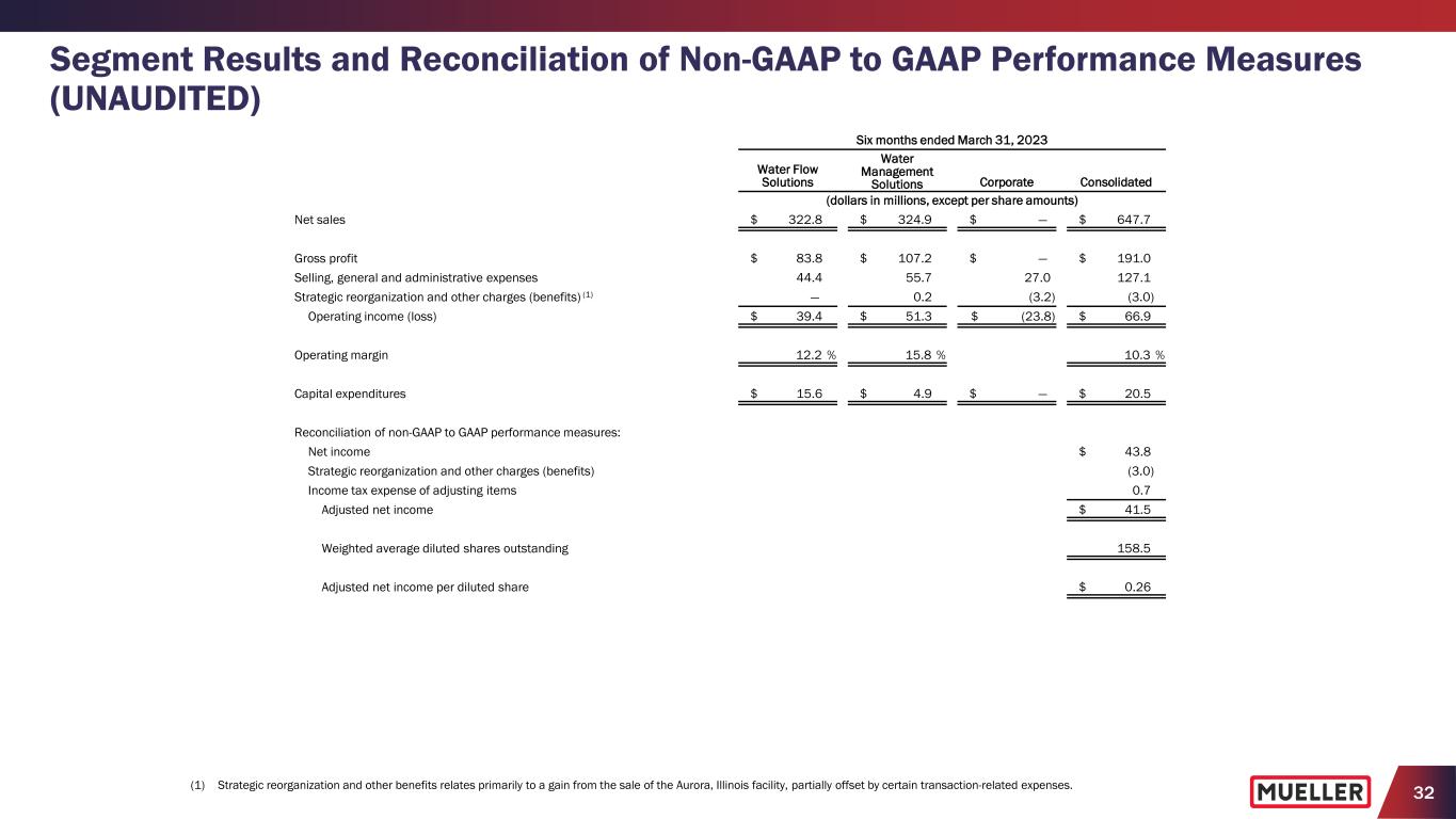 31 Segment Results and Reconciliation of Non-GAAP to GAAP Performance Measures (UNAUDITED) Three months ended March 31, 2022 Water Flow Solutions Water Management Solutions Corporate Consolidated (dollars in millions, except per share amounts) Net income $ 23.6 Income tax expense (2) 7.1 Interest expense, net (2) 4.5 Pension benefit other than service (2) (1.0) Operating income (loss) $ 35.4 $ 11.7 $ (12.9) 34.2 Strategic reorganization and other charges (1) — 0.1 0.5 0.6 Adjusted operating income (loss) 35.4 11.8 (12.4) 34.8 Pension benefit other than service — — 1.0 1.0 Depreciation and amortization 7.5 7.3 — 14.8 Adjusted EBITDA $ 42.9 $ 19.1 $ (11.4) $ 50.6 Adjusted operating margin 19.2 % 9.3 % 11.2 % Adjusted EBITDA margin 23.3 % 15.1 % 16.3 % Adjusted EBITDA $ 42.9 $ 19.1 $ (11.4) $ 50.6 Three prior quarters’ adjusted EBITDA 122.4 69.0 (35.7) 155.7 Trailing twelve months’ adjusted EBITDA $ 165.3 $ 88.1 $ (47.1) $ 206.3 Reconciliation of net debt to total debt (end of period): Current portion of long-term debt $ 1.0 Long-term debt 446.1 Total debt 447.1 Less cash and cash equivalents 164.1 Net debt $ 283.0 Net debt leverage (net debt divided by trailing twelve months’ adjusted EBITDA) 1.4x Reconciliation of free cash flow to net cash used in operating activities: Net cash used in operating activities $ (19.0) Less capital expenditures (15.0) Free cash flow $ (34.0) (1) Strategic reorganization and other charges includes restructuring expenses associated with the closure of our facilities in Aurora, Illinois, and Surrey, British Columbia, Canada. (2) The Company does not allocate interest, income taxes or pension benefit (expense) other than service to its segments.