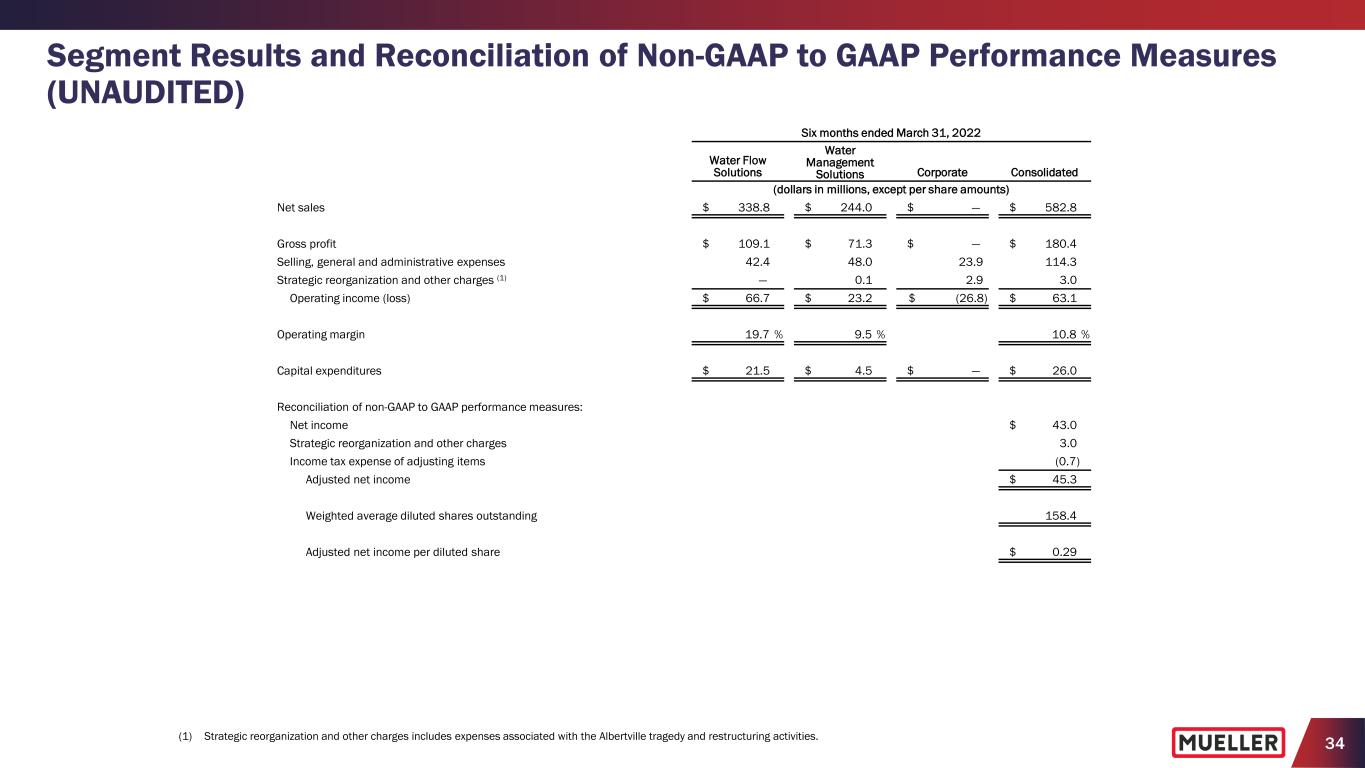 33 Segment Results and Reconciliation of Non-GAAP to GAAP Performance Measures (UNAUDITED) Six months ended March 31, 2023 Water Flow Solutions Water Management Solutions Corporate Consolidated (dollars in millions, except per share amounts) Net income $ 43.8 Income tax expense (2) 13.6 Interest expense, net (2) 7.6 Pension expense other than service (2) 1.9 Operating income (loss) $ 39.4 $ 51.3 $ (23.8) 66.9 Strategic reorganization and other charges (1) — 0.2 (3.2) (3.0) Adjusted operating income (loss) 39.4 51.5 (27.0) 63.9 Pension benefit other than service — — (1.9) (1.9) Depreciation and amortization 15.5 14.7 0.1 30.3 Adjusted EBITDA $ 54.9 $ 66.2 $ (28.8) $ 92.3 Adjusted operating margin 12.2 % 15.9 % 9.9 % Adjusted EBITDA margin 17.0 % 20.4 % 14.3 % Reconciliation of free cash flow to net cash used in operating activities: Net cash used in operating activities $ (22.2) Less capital expenditures (20.5) Free cash flow $ (42.7) (1) Strategic reorganization and other benefits relates primarily to a gain from the sale of the Aurora, Illinois facility, partially offset by certain transaction-related expenses. (2) The Company does not allocate interest, income taxes or pension benefit (expense) other than service to its segments.