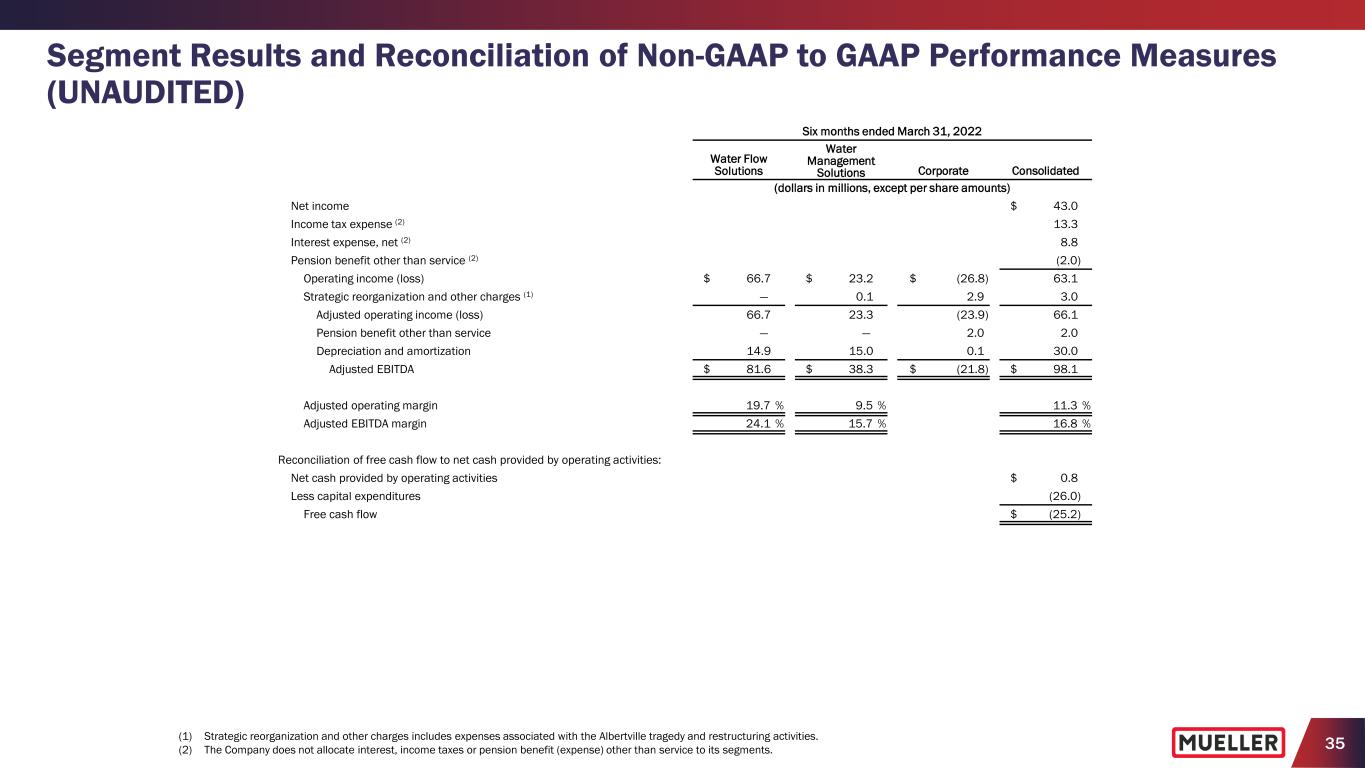 34 Segment Results and Reconciliation of Non-GAAP to GAAP Performance Measures (UNAUDITED) Six months ended March 31, 2022 Water Flow Solutions Water Management Solutions Corporate Consolidated (dollars in millions, except per share amounts) Net sales $ 338.8 $ 244.0 $ — $ 582.8 Gross profit $ 109.1 $ 71.3 $ — $ 180.4 Selling, general and administrative expenses 42.4 48.0 23.9 114.3 Strategic reorganization and other charges (1) — 0.1 2.9 3.0 Operating income (loss) $ 66.7 $ 23.2 $ (26.8) $ 63.1 Operating margin 19.7 % 9.5 % 10.8 % Capital expenditures $ 21.5 $ 4.5 $ — $ 26.0 Reconciliation of non-GAAP to GAAP performance measures: Net income $ 43.0 Strategic reorganization and other charges 3.0 Income tax expense of adjusting items (0.7) Adjusted net income $ 45.3 Weighted average diluted shares outstanding 158.4 Adjusted net income per diluted share $ 0.29 (1) Strategic reorganization and other charges includes expenses associated with the Albertville tragedy and restructuring activities.