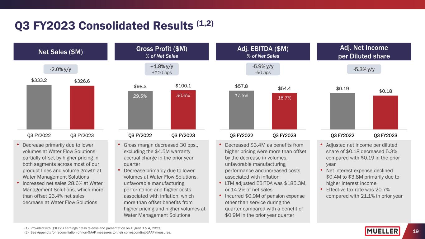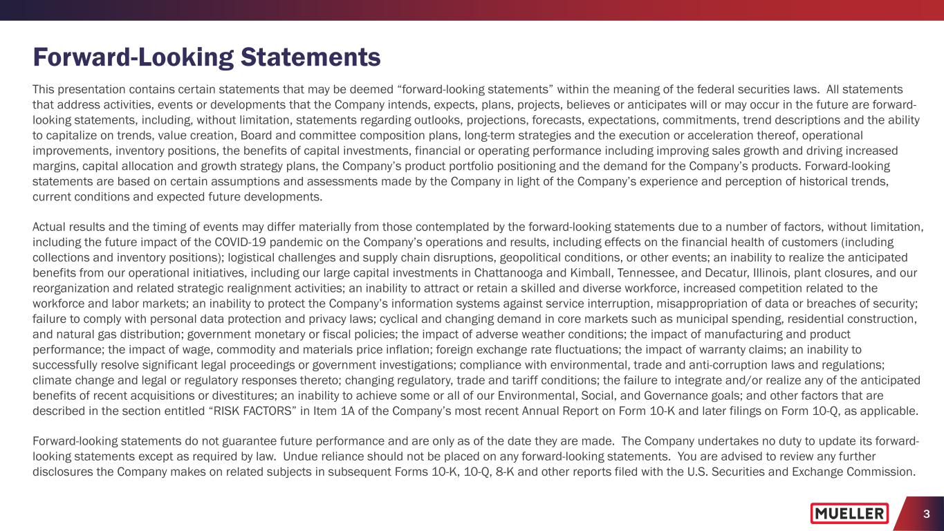 2 Non-GAAP Financial Measures In an effort to provide investors with additional information regarding the Company’s results as determined by accounting principles generally accepted in the United States (“GAAP”), the Company also provides non-GAAP information that management believes is useful to investors. These non-GAAP measures have limitations as analytical tools, and securities analysts, investors and other interested parties should not consider any of these non-GAAP measures in isolation or as a substitute for analysis of the Company’s results as reported under GAAP. These non-GAAP measures may not be comparable to similarly titled measures used by other companies. The Company presents adjusted net income, adjusted net income per diluted share, adjusted operating income, adjusted operating margin, adjusted EBITDA and adjusted EBITDA margin as performance measures because management uses these measures to evaluate the Company’s underlying performance on a consistent basis across periods and to make decisions about operational strategies. Management also believes these measures are frequently used by securities analysts, investors and other interested parties in the evaluation of the Company’s recurring performance. The Company presents net debt and net debt leverage as performance measures because management uses them to evaluate its capital management and financial position, and the investment community commonly uses them as measures of indebtedness. The Company presents free cash flow to assist management and investors in analyzing the Company’s ability to generate liquidity from its operating activities. The calculations of these non-GAAP measures and reconciliations to GAAP results are included as an attachment to this presentation, which has been posted online at www.muellerwaterproducts.com. The Company does not reconcile forward-looking non-GAAP measures to the comparable GAAP measures, as permitted by Regulation S-K, as certain items, e.g., expenses related to corporate development activities, transactions, pension expenses/(benefits) and corporate restructuring, may have not yet occurred, are out of the Company’s control and/or cannot be reasonably predicted without unreasonable efforts. Additionally, such reconciliation would imply a degree of precision and certainty regarding relevant items that may be confusing to investors. Such items could have a substantial impact on GAAP measures of the Company's financial performance.