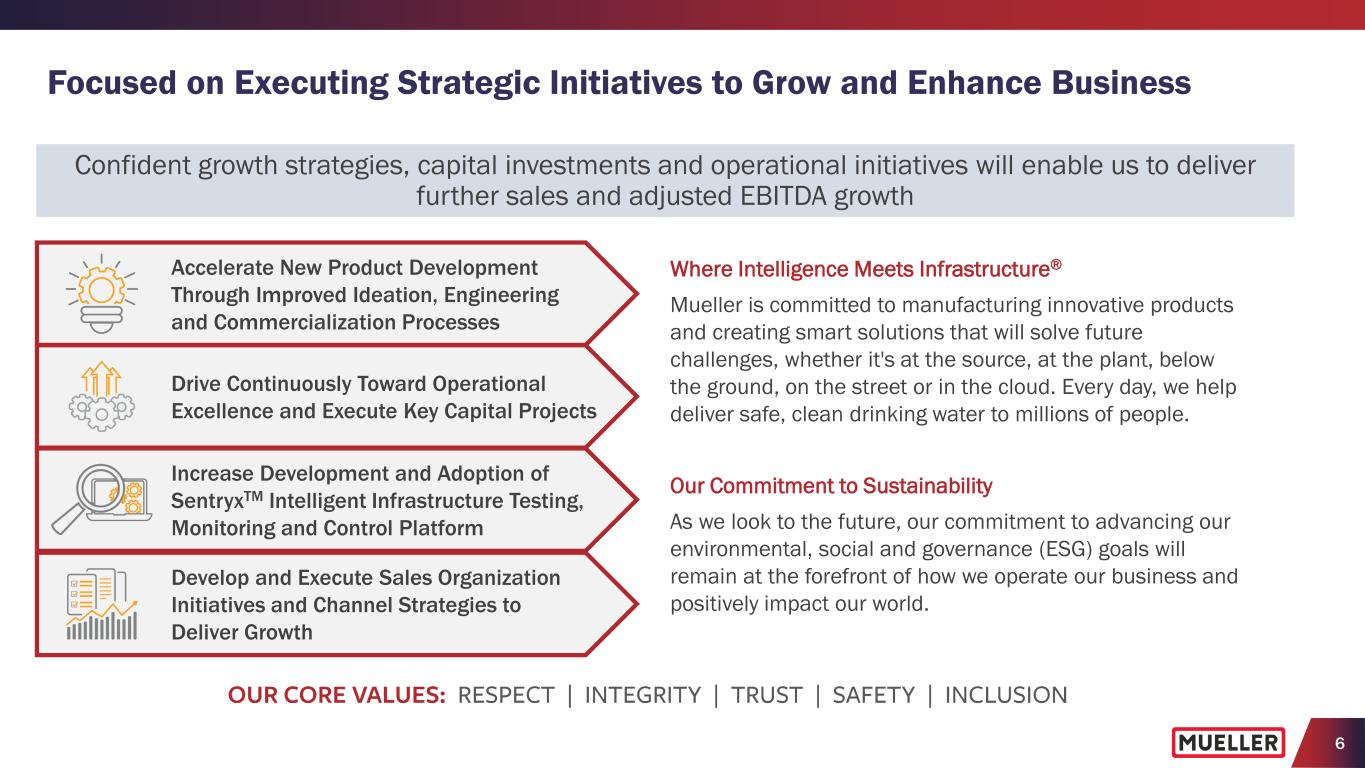 5 • Leading brand and municipal market specification positions with large installed base • Comprehensive distribution network and strong end-user relationships with end-markets served by limited number of suppliers • Low-cost manufacturing operations using lost foam process • Favorable market dynamics in municipal and residential end-markets • Aging infrastructure accelerating need for investment, estimated at $1.7 trillion according to the American Water Works Association, with $55 billion of new funding included in the federal infrastructure bill to upgrade drinking water and wastewater infrastructure (1) • Enhanced operational excellence initiatives delivering ongoing productivity improvements • Prioritizing capital investments to modernize manufacturing facilities, equipment and processes to drive margin expansion and continued investment in product development • Expanding capabilities for American-made products and advancing sustainability initiatives • Potential adoption of technology-enabled products by water utilities to actively diagnose, monitor and control the delivery of drinking water • Proprietary fixed leak detection, pipe condition assessment, smart metering and software offerings for utilities to have flexible and scalable platform for infrastructure monitoring • Flexible balance sheet with 1.7x net debt leverage and ample liquidity with $303.5 million available • Enabling growth through capital investments and acquisitions, while historically returning cash to shareholders through dividends and share repurchases LONG-TERM END MARKET DYNAMICS SUPPORTED BY ACCELERATION OF CHALLENGES FACING WATER INFRASTRUCTURE ACCELERATING PRODUCT DEVELOPMENT AND LEVERAGING STRENGTHS TO INCREASE TECHNOLOGY-ENABLED PRODUCTS MODERNIZING MANUFACTURING AND DRIVING OPERATIONAL EXCELLENCE TO DELIVER GROSS MARGIN EXPANSION STRONG, FLEXIBLE BALANCE SHEET AND GROWING FREE CASH FLOW WITH AMPLE LIQUIDITY STRONG COMPETITIVE POSITION WITH BROAD PORTFOLIO OF PRODUCTS AND SOLUTIONS (1) American Water Works Association, Buried No Longer: Confronting America’s Water Infrastructure Challenge 2012 Investment Highlights
