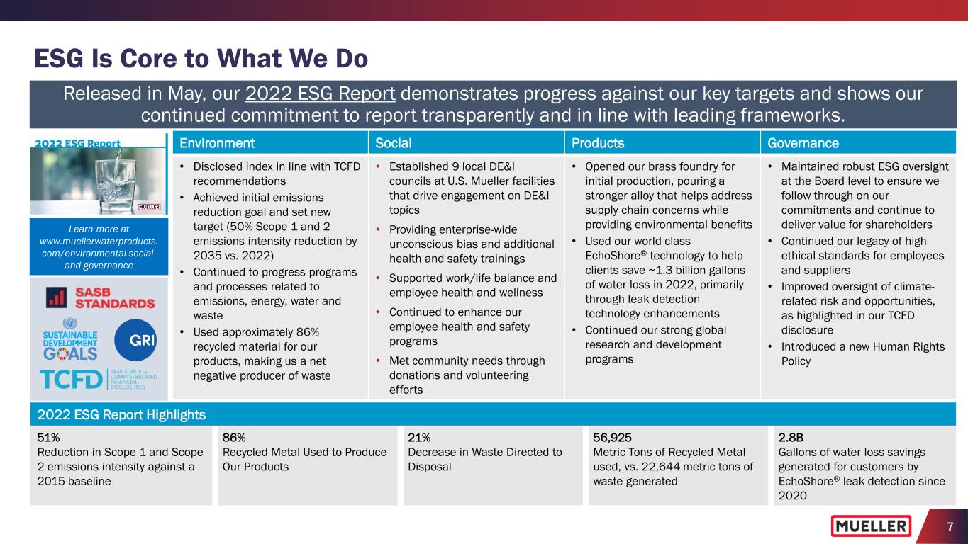 6 Focused on Executing Strategic Initiatives to Grow and Enhance Business Confident growth strategies, capital investments and operational initiatives will enable us to deliver further sales and adjusted EBITDA growth Where Intelligence Meets Infrastructure® Mueller is committed to manufacturing innovative products and creating smart solutions that will solve future challenges, whether it's at the source, at the plant, below the ground, on the street or in the cloud. Every day, we help deliver safe, clean drinking water to millions of people. Our Commitment to Sustainability As we look to the future, our commitment to advancing our environmental, social and governance (ESG) goals will remain at the forefront of how we operate our business and positively impact our world. Accelerate New Product Development Through Improved Ideation, Engineering and Commercialization Processes Drive Continuously Toward Operational Excellence and Execute Key Capital Projects Increase Development and Adoption of SentryxTM Intelligent Infrastructure Testing, Monitoring and Control Platform Develop and Execute Sales Organization Initiatives and Channel Strategies to Deliver Growth