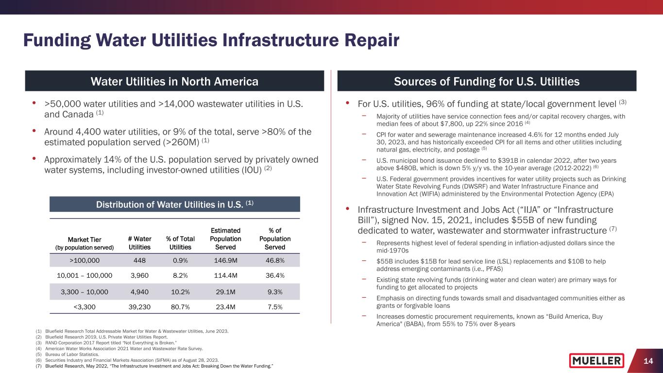 13 Aging Infrastructure Increasing Water Main Breaks (1) Bluefield Research 2019, Water Industry 4.0 Focus Report. (2) U.S. Environmental Protection Agency, “Drinking Water Infrastructure Needs Survey and Assessment, Sixth Report to Congress,” March 2018. (3) EPA Aging Water Infrastructure Research Program. (4) “Water Main Break Rates in the USA and Canada: A Comprehensive Study,” March 2018, Steven Folkman at Utah State University, https://digitalcommons.usu.edu/cgi/viewcontent.cgi?article=1173&context=mae_facpub. (5) Navigant Research. (6) National Resource Defense Council. (7) Bluefield Research, February 2022, “U.S. Water & Sewer Pipe Network Infrastructure: Market Trends and Forecasts, 2022 – 2030.” • Average age of water pipes has increased to 45 years in 2020 from 25 years in 1970 (1) • 2.2 million miles of underground pipes for drinking water with 240,000 water main breaks per year (2,3) • Up to 30% of treated water is lost or unaccounted for in the water system (5) • Growing number of states requiring water loss audits (6) Water Main Break Rates Increasing (4)Aging of Pipe Infrastructure • According to a study by Steven Folkman at Utah State University that surveyed nearly 200,000 miles of water pipelines in more than 300 municipalities in the U.S. and Canada, serving more than 14% of the two countries’ total population: − Between 2012 and 2018, overall water main break rates increased by 27%, to 14 from 11 breaks/100 miles/year − More concerning is that breakage rates of cast iron and asbestos cement pipe — which make up 41% of the installed water mains in the U.S. and Canada — have increased by more than 40% over those six years − 82% of cast iron pipes are more than 50 years old and experiencing a 46% increase in break rates − Smaller utilities have two times more main breaks than large utilities − Nationwide, one mile of installed water main serves 308 people − The average age of failing water mains is approximately 50 years − Over 16% of North America’s underground water infrastructure is past its design service life Average age of pipe infrastructure, by region (7)