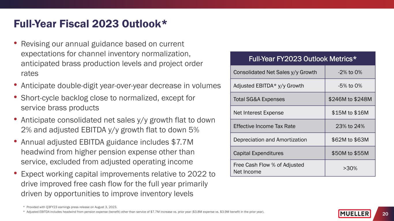 19 Q3 FY2023 Consolidated Results (1,2) (1) Provided with Q3FY23 earnings press release and presentation on August 3 & 4, 2023. (2) See Appendix for reconciliation of non-GAAP measures to their corresponding GAAP measures. • Decrease primarily due to lower volumes at Water Flow Solutions partially offset by higher pricing in both segments across most of our product lines and volume growth at Water Management Solutions • Increased net sales 28.6% at Water Management Solutions, which more than offset 23.4% net sales decrease at Water Flow Solutions • Gross margin decreased 30 bps., excluding the $4.5M warranty accrual charge in the prior year quarter • Decrease primarily due to lower volumes at Water Flow Solutions, unfavorable manufacturing performance and higher costs associated with inflation, which more than offset benefits from higher pricing and higher volumes at Water Management Solutions • Decreased $3.4M as benefits from higher pricing were more than offset by the decrease in volumes, unfavorable manufacturing performance and increased costs associated with inflation • LTM adjusted EBITDA was $185.3M, or 14.2% of net sales • Incurred $0.9M of pension expense other than service during the quarter compared with a benefit of $0.9M in the prior year quarter • Adjusted net income per diluted share of $0.18 decreased 5.3% compared with $0.19 in the prior year • Net interest expense declined $0.4M to $3.8M primarily due to higher interest income • Effective tax rate was 20.7% compared with 21.1% in prior year Adj. EBITDA ($M) % of Net Sales $57.8 $54.4 Q3 FY2022 Q3 FY2023 -5.9% y/y -60 bps Adj. Net Income per Diluted share $0.19 $0.18 Q3 FY2022 Q3 FY2023 -5.3% y/y 17.3% 16.7% Gross Profit ($M) % of Net Sales $98.3 $100.1 Q3 FY2022 Q3 FY2023 +1.8% y/y +110 bps $333.2 $326.6 Q3 FY2022 Q3 FY2023 Net Sales ($M) -2.0% y/y 30.6%29.5%