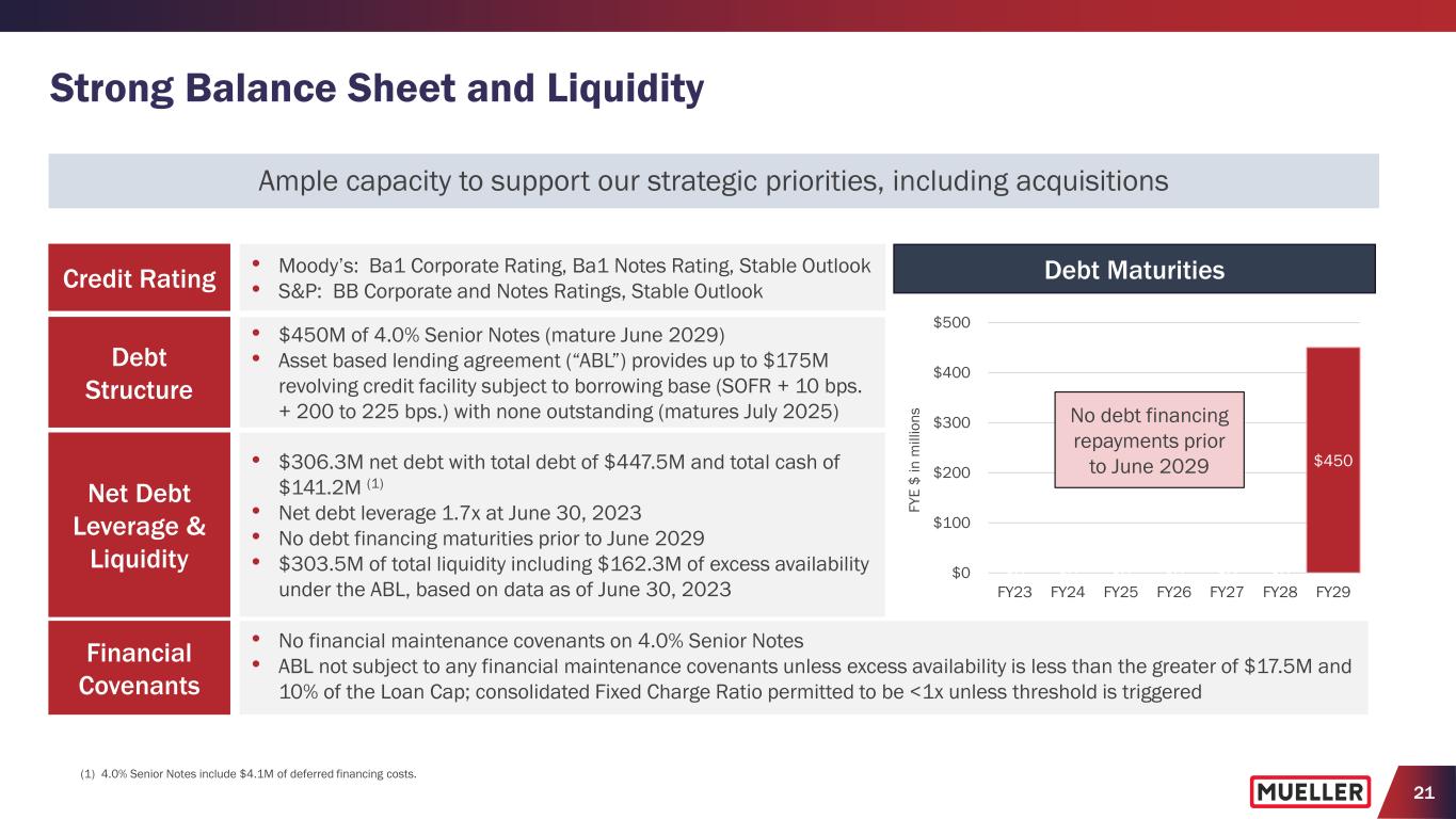 20 Full-Year Fiscal 2023 Outlook* • Revising our annual guidance based on current expectations for channel inventory normalization, anticipated brass production levels and project order rates • Anticipate double-digit year-over-year decrease in volumes • Short-cycle backlog close to normalized, except for service brass products • Anticipate consolidated net sales y/y growth flat to down 2% and adjusted EBITDA y/y growth flat to down 5% • Annual adjusted EBITDA guidance includes $7.7M headwind from higher pension expense other than service, excluded from adjusted operating income • Expect working capital improvements relative to 2022 to drive improved free cash flow for the full year primarily driven by opportunities to improve inventory levels * Provided with Q3FY23 earnings press release on August 3, 2023. * Adjusted EBITDA includes headwind from pension expense (benefit) other than service of $7.7M increase vs. prior year ($3.8M expense vs. $3.9M benefit in the prior year). Full-Year FY2023 Outlook Metrics* Consolidated Net Sales y/y Growth -2% to 0% Adjusted EBITDA* y/y Growth -5% to 0% Total SG&A Expenses $246M to $248M Net Interest Expense $15M to $16M Effective Income Tax Rate 23% to 24% Depreciation and Amortization $62M to $63M Capital Expenditures $50M to $55M Free Cash Flow % of Adjusted Net Income >30%