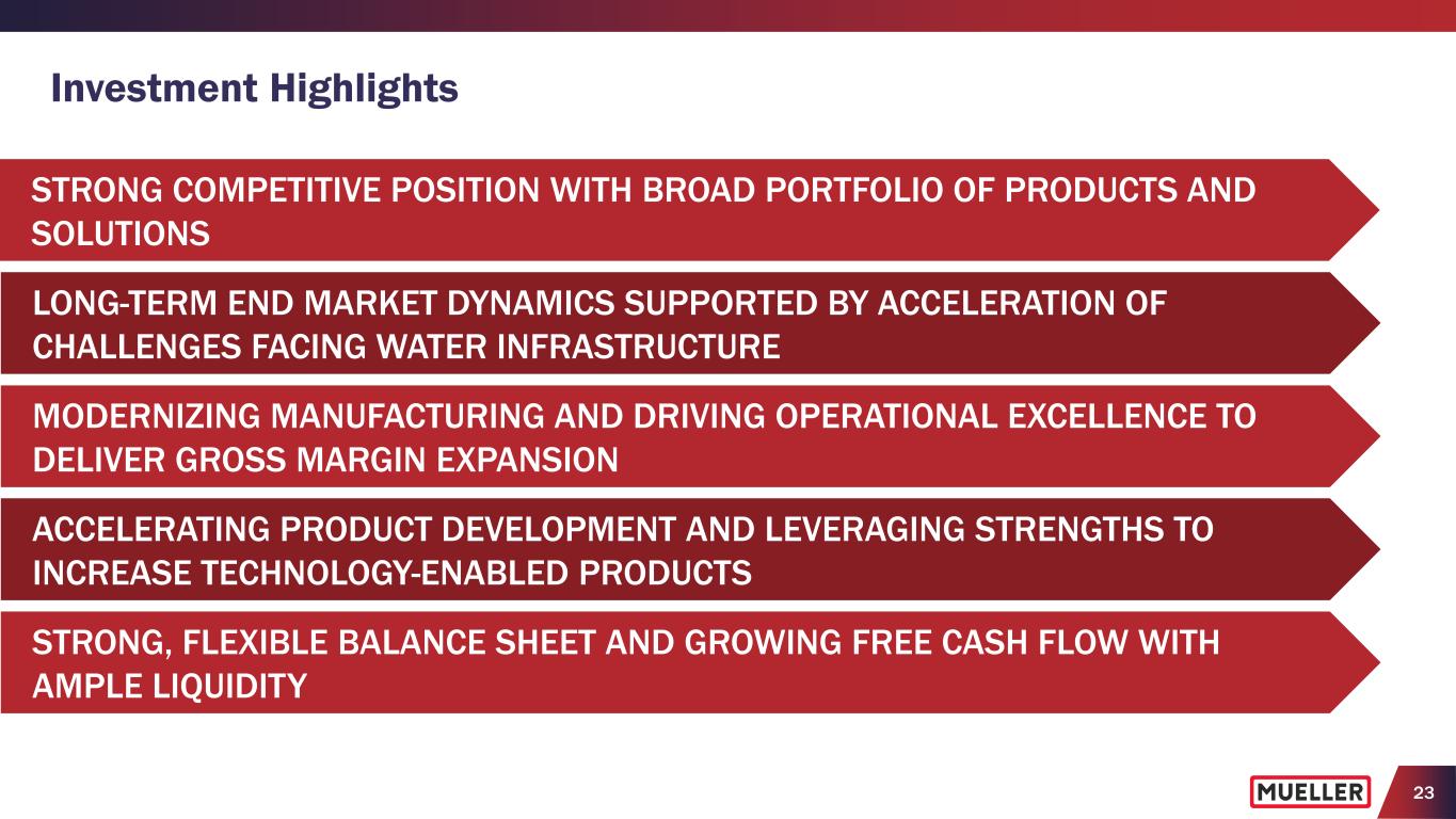 22 Balanced and Disciplined Capital Allocation • Strong balance sheet, liquidity and cash flow supporting our strategies • Maintaining balanced approach to capital allocation to strengthen and grow the business through capital investments and bolt-on acquisitions • Continuing to return cash to our shareholders, primarily through our ongoing quarterly dividend – Paid quarterly dividend since becoming a publicly- traded company – Increased quarterly dividend 7 times since FY15 – Allocated $35M to share repurchases in FY22 with $100M remaining authorization on our share repurchase program as of June 30, 2023 Shareholders 31% Balance Sheet* 9% Strategic Investments* 60% $256M to Shareholders - $166M dividends - $90M share repurchases Cash Allocation Over Past 5 Years* $493M to Strategic Investments - $328M capital expenditures - $165M acquisitions * 5-year period includes FY18, FY19, FY20, FY21, FY22; Strategic Investments includes consolidated capital expenditures and cash paid for acquisitions of Krausz Industries, Pratt Industrial JV and i2O Water (excludes proceeds from sales of assets); Balance Sheet includes debt retirement and pension plan payments ($2M to exit Canadian and multiemployer plans) and includes $22M payment for Walter Tax Settlement). Capital Allocation Priorities