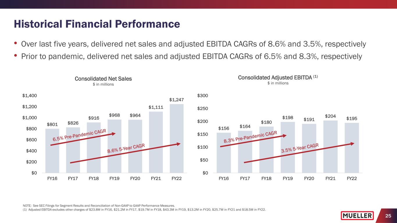 4 (1) See Appendix for reconciliation of non-GAAP measures to their corresponding GAAP measures. (2) Consolidated net sales Information for geography, segments, products and end markets based on FY2022 information and estimates. (3) Water Flow Solutions includes iron gate valves, specialty valves and service brass products. Water Management Solutions includes fire hydrants, repair and installation, natural gas, metering, leak detection, pressure control and software products. Water Flow Solutions Water Management Solutions United States Rest of World Geography (2) (% of Consolidated Net Sales) • Founded more than 165 years ago • Spun off from Walter Industries in 2006 • Listed on NYSE (MWA) (June 2006) • Divested U.S. Pipe (April 2012) • Divested Anvil (January 2017) • Acquired Singer Valve (February 2017) • Acquired Krausz Industries (December 2018) • Acquired i20 Water (June 2021) Segments (2,3) (% of Consolidated Net Sales) <10% Natural gas utilities 60-65% Repair and replacement of municipal water systems 25-30% Residential construction Brass Products Hydrants & Gate Valves Specialty Valves Technology- Enabled Products (2) (% of Consolidated Net Sales) End Markets (2) (% of Consolidated Net Sales) Canada History Highlights (1) $1.3B Net Sales (LTM Q3 FY2023) $185.3M Adjusted EBITDA (LTM Q3 FY2023) $327.4M Capital Expenditures (5-Year FY18-FY22) 14.2% Adjusted EBITDA % of Net Sales (LTM Q3 FY2023) $574.9M Cash Flow from Operations (5-Year FY18-FY22) $247.5M Free Cash Flow (5-Year FY18-FY22) $306.3M Net Debt (June 30, 2023) 1.7x Net Debt to Adjusted EBITDA (June 30, 2023) 3,600 Employees Worldwide 11 Manufacturing Facilities 5 R&D Centers Mueller Water Products at a Glance Repair
