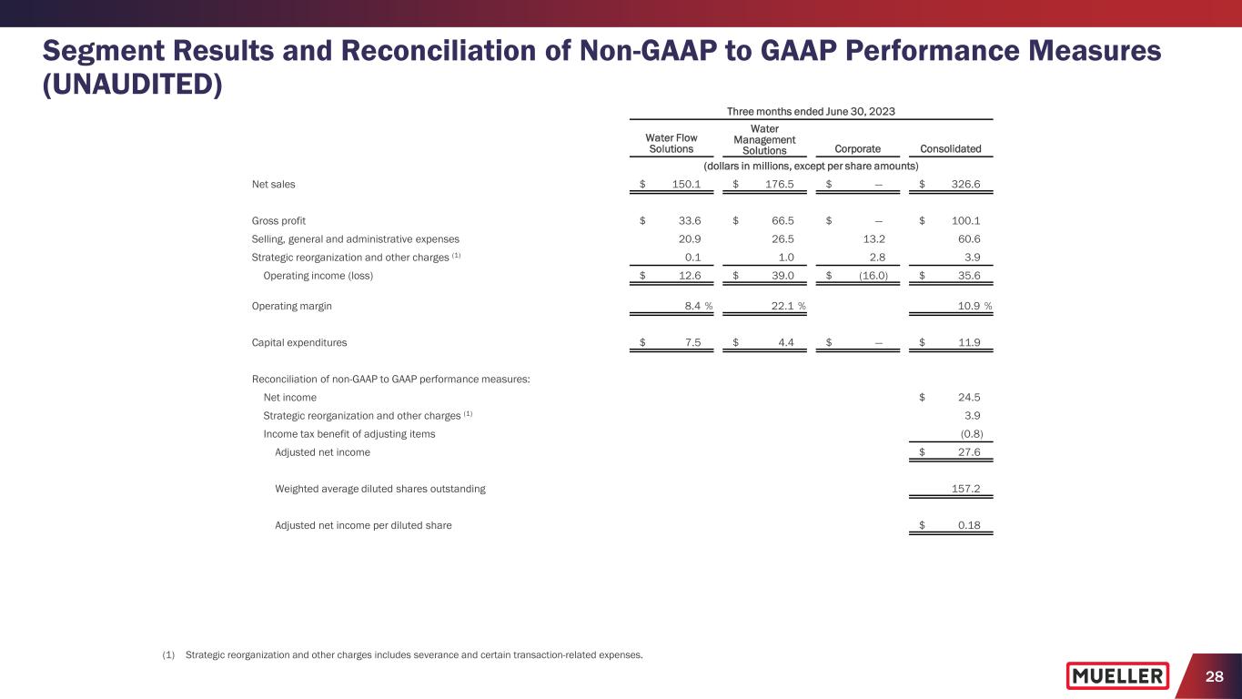 30 Segment Results and Reconciliation of Non-GAAP to GAAP Performance Measures (UNAUDITED) Three months ended June 30, 2022 Water Flow Solutions Water Management Solutions Corporate Consolidated (dollars in millions, except per share amounts) Net sales $ 195.9 $ 137.3 $ — $ 333.2 Gross profit $ 60.8 $ 37.5 $ — $ 98.3 Selling, general and administrative expenses 22.7 25.5 12.6 60.8 Strategic reorganization and other charges (1) — — 0.6 0.6 Operating income (loss) $ 38.1 $ 12.0 $ (13.2) $ 36.9 Operating margin 19.4 % 8.7 % 11.1 % Capital expenditures $ 8.1 $ 2.6 $ — $ 10.7 Reconciliation of non-GAAP to GAAP performance measures: Net income $ 26.5 Warranty charge (2) 4.5 Strategic reorganization and other charges (1) 0.6 Income tax benefit of adjusting items (1.1) Adjusted net income $ 30.5 Weighted average diluted shares outstanding 157.6 Adjusted net income per diluted share $ 0.19 (1) Strategic reorganization and other charges includes charges related to the closure of our facilities in Aurora, Illinois and Surrey, British Columbia, Canada. (2) The Company recorded a charge of $4.5 million in connection with its warranty obligations.