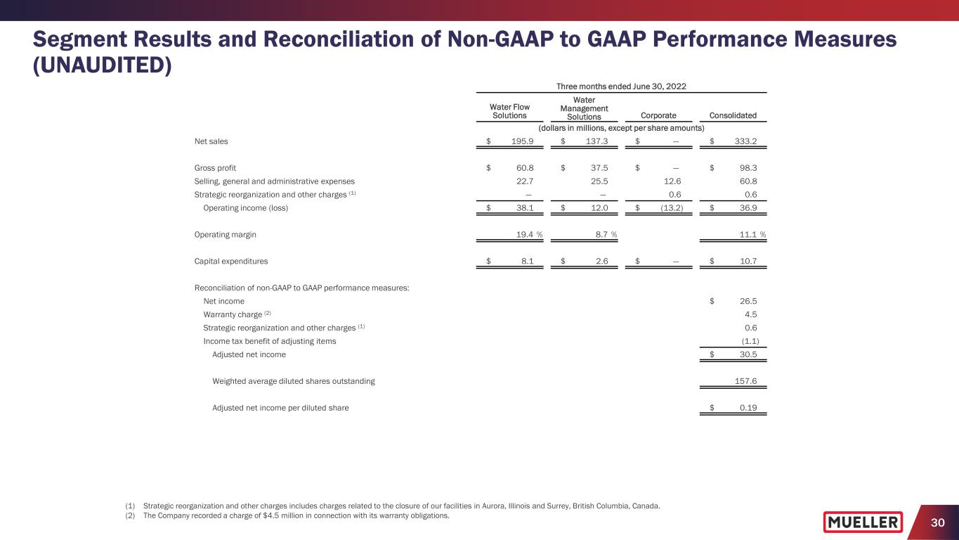 29 Segment Results and Reconciliation of Non-GAAP to GAAP Performance Measures (UNAUDITED) Three months ended June 30, 2023 Water Flow Solutions Water Management Solutions Corporate Consolidated (dollars in millions, except per share amounts) Net income $ 24.5 Income tax expense (2) 6.4 Interest expense, net (2) 3.8 Pension expense other than service (2) 0.9 Operating income (loss) $ 12.6 $ 39.0 $ (16.0) 35.6 Strategic reorganization and other charges (1) 0.1 1.0 2.8 3.9 Adjusted operating income (loss) 12.7 40.0 (13.2) 39.5 Pension expense other than service — — (0.9) (0.9) Depreciation and amortization 8.2 7.6 — 15.8 Adjusted EBITDA $ 20.9 $ 47.6 $ (14.1) $ 54.4 Adjusted operating margin 8.5 % 22.7 % 12.1 % Adjusted EBITDA margin 13.9 % 27.0 % 16.7 % Adjusted EBITDA $ 20.9 $ 47.6 $ (14.1) $ 54.4 Three prior quarters' adjusted EBITDA 82.9 88.1 (40.1) 130.9 Trailing twelve months' adjusted EBITDA $ 103.8 $ 135.7 $ (54.2) $ 185.3 Reconciliation of net debt to total debt (end of period): Current portion of long term debt $ 0.8 Long-term debt 446.7 Total debt 447.5 Less cash and cash equivalents 141.2 Net debt $ 306.3 Net debt leverage (net debt divided by trailing twelve months' adjusted EBITDA) 1.7x Reconciliation of free cash flow to net cash provided by operating activities: Net cash provided by operating activities $ 74.7 Less capital expenditures 11.9 Free cash flow $ 62.8 (1) Strategic reorganization and other charges includes severance and certain transaction-related expenses. (2) The Company does not allocate interest, income taxes or pension benefit (expense) other than service to its segments.
