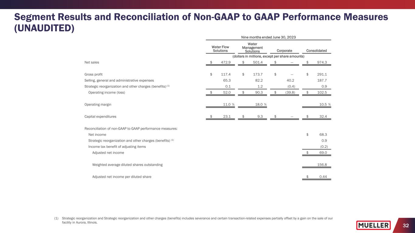 31 Segment Results and Reconciliation of Non-GAAP to GAAP Performance Measures (UNAUDITED) Three months ended June 30, 2022 Water Flow Solutions Water Management Solutions Corporate Consolidated (dollars in millions, except per share amounts) Net income $ 26.5 Income tax expense (3) 7.1 Interest expense, net (3) 4.2 Pension benefit other than service (3) (0.9) Operating income (loss) $ 38.1 $ 12.0 $ (13.2) 36.9 Warranty charge (2) — 4.5 — 4.5 Strategic reorganization and other charges (1) — — 0.6 0.6 Adjusted operating income (loss) 38.1 16.5 (12.6) 42.0 Pension benefit other than service (3) — — 0.9 0.9 Depreciation and amortization 7.6 7.2 0.1 14.9 Adjusted EBITDA $ 45.7 $ 23.7 $ (11.6) $ 57.8 Adjusted operating margin 19.4 % 12.0 % 12.6 % Adjusted EBITDA margin 23.3 % 17.3 % 17.3 % Adjusted EBITDA $ 45.7 $ 23.7 $ (11.6) $ 57.8 Three prior quarters' adjusted EBITDA 117.2 59.6 (33.1) 143.7 Trailing twelve months' adjusted EBITDA $ 162.9 $ 83.3 $ (44.7) $ 201.5 Reconciliation of net debt to total debt (end of period): Current portion of long term debt $ 0.9 Long-term debt 446.1 Total debt 447.0 Less cash and cash equivalents 154.9 Net debt $ 292.1 Net debt leverage (net debt divided by trailing twelve months' adjusted EBITDA) 1.4x Reconciliation of free cash flow to net cash provided by operating activities: Net cash provided by operating activities $ 19.7 Less capital expenditures 10.7 Free cash flow $ 9.0 (1) Strategic reorganization and other charges includes charges related to the closure of our facilities in Aurora, Illinois and Surrey, British Columbia, Canada. (2) The Company recorded a charge of $4.5 million in connection with its warranty obligations. (3) The Company does not allocate interest, income taxes or pension benefit (expense) other than service to its segments.