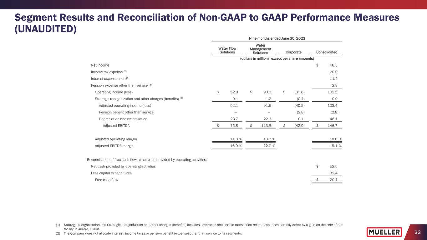 32 Segment Results and Reconciliation of Non-GAAP to GAAP Performance Measures (UNAUDITED) (1) Strategic reorganization and Strategic reorganization and other charges (benefits) includes severance and certain transaction-related expenses partially offset by a gain on the sale of our facility in Aurora, Illinois. Nine months ended June 30, 2023 Water Flow Solutions Water Management Solutions Corporate Consolidated (dollars in millions, except per share amounts) Net sales $ 472.9 $ 501.4 $ — $ 974.3 Gross profit $ 117.4 $ 173.7 $ — $ 291.1 Selling, general and administrative expenses 65.3 82.2 40.2 187.7 Strategic reorganization and other charges (benefits) (1) 0.1 1.2 (0.4) 0.9 Operating income (loss) $ 52.0 $ 90.3 $ (39.8) $ 102.5 Operating margin 11.0 % 18.0 % 10.5 % Capital expenditures $ 23.1 $ 9.3 $ — $ 32.4 Reconciliation of non-GAAP to GAAP performance measures: Net income $ 68.3 Strategic reorganization and other charges (benefits) (1) 0.9 Income tax benefit of adjusting items (0.2) Adjusted net income $ 69.0 Weighted average diluted shares outstanding 156.8 Adjusted net income per diluted share $ 0.44